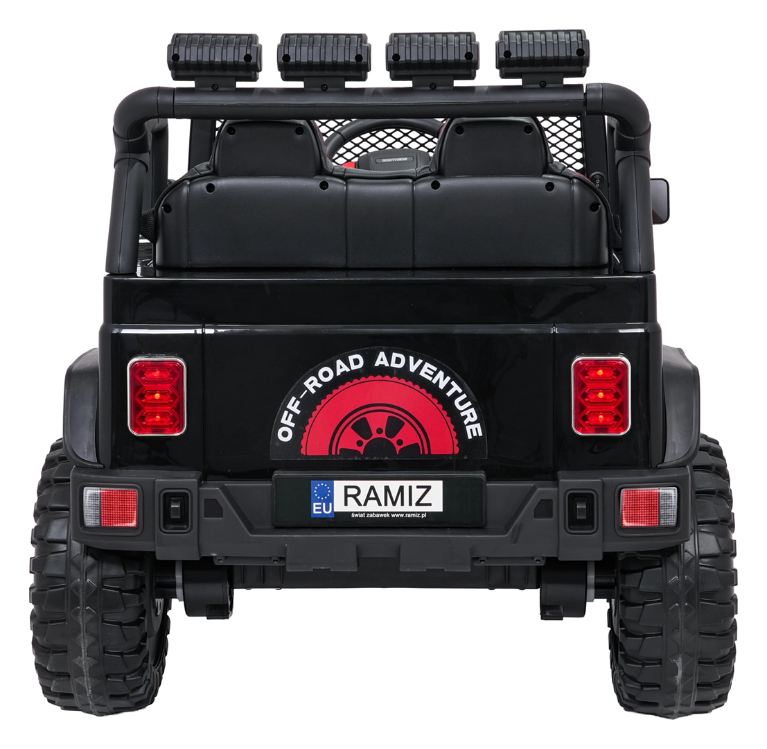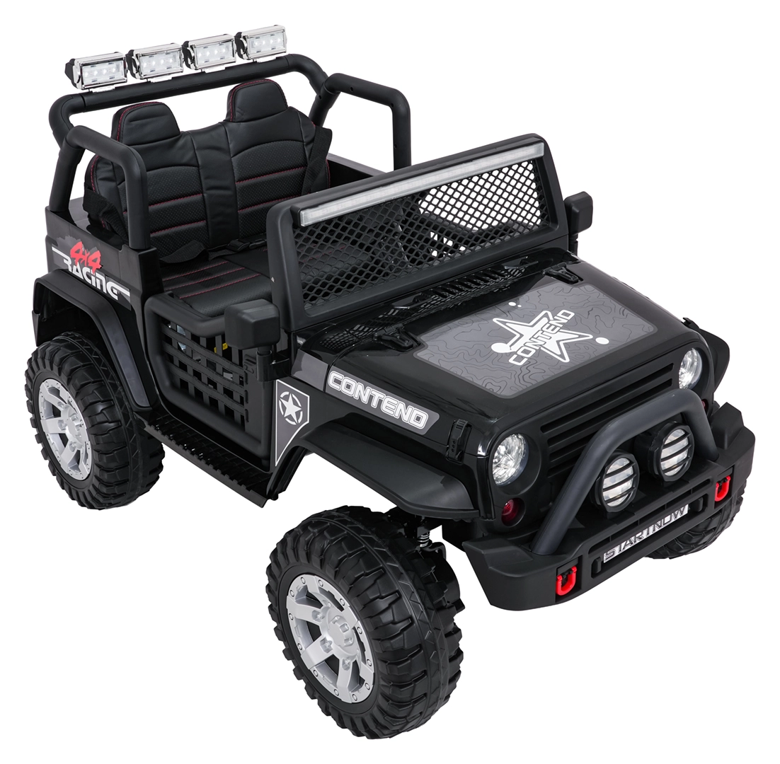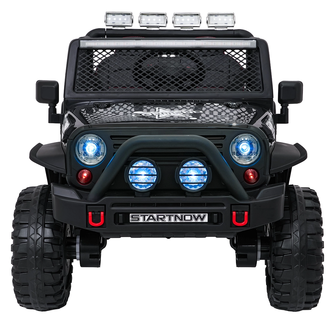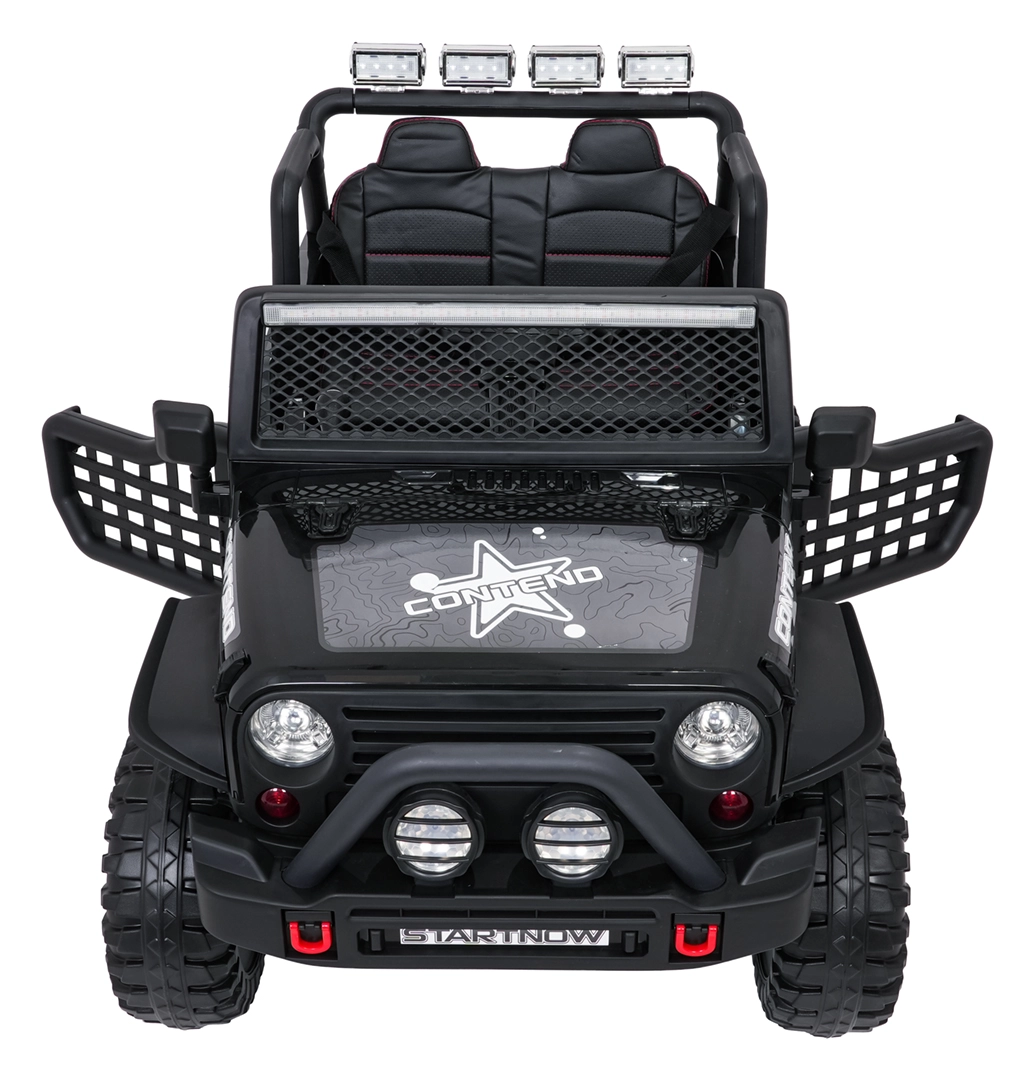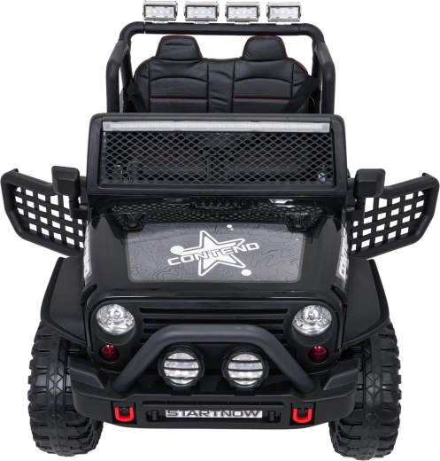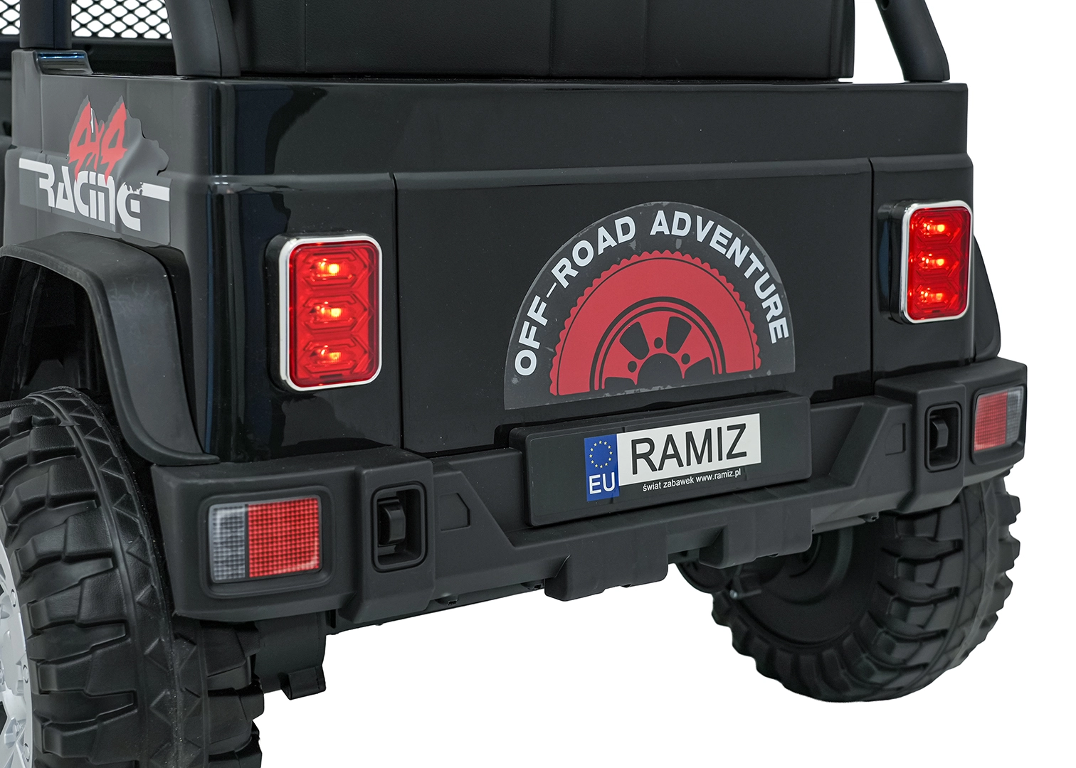 Dieser schwarze Offroad-Champion ist für Abenteuer gemacht. Dank Allradantrieb 4x4, hoher Bodenfreiheit und weichen EVA-Rädern meistert er Unebenheiten und Gartengelände. Sanftes Anfahren, zwei Geschwindigkeiten sowie Vorwärts-/Rückwärtsfahrt sorgen für komfortable und sichere Bedienung. Die LED-Beleuchtung (vorne, hinten und Dachlichtleiste) verleiht einen realistischen Look und bessere Sichtbarkeit.