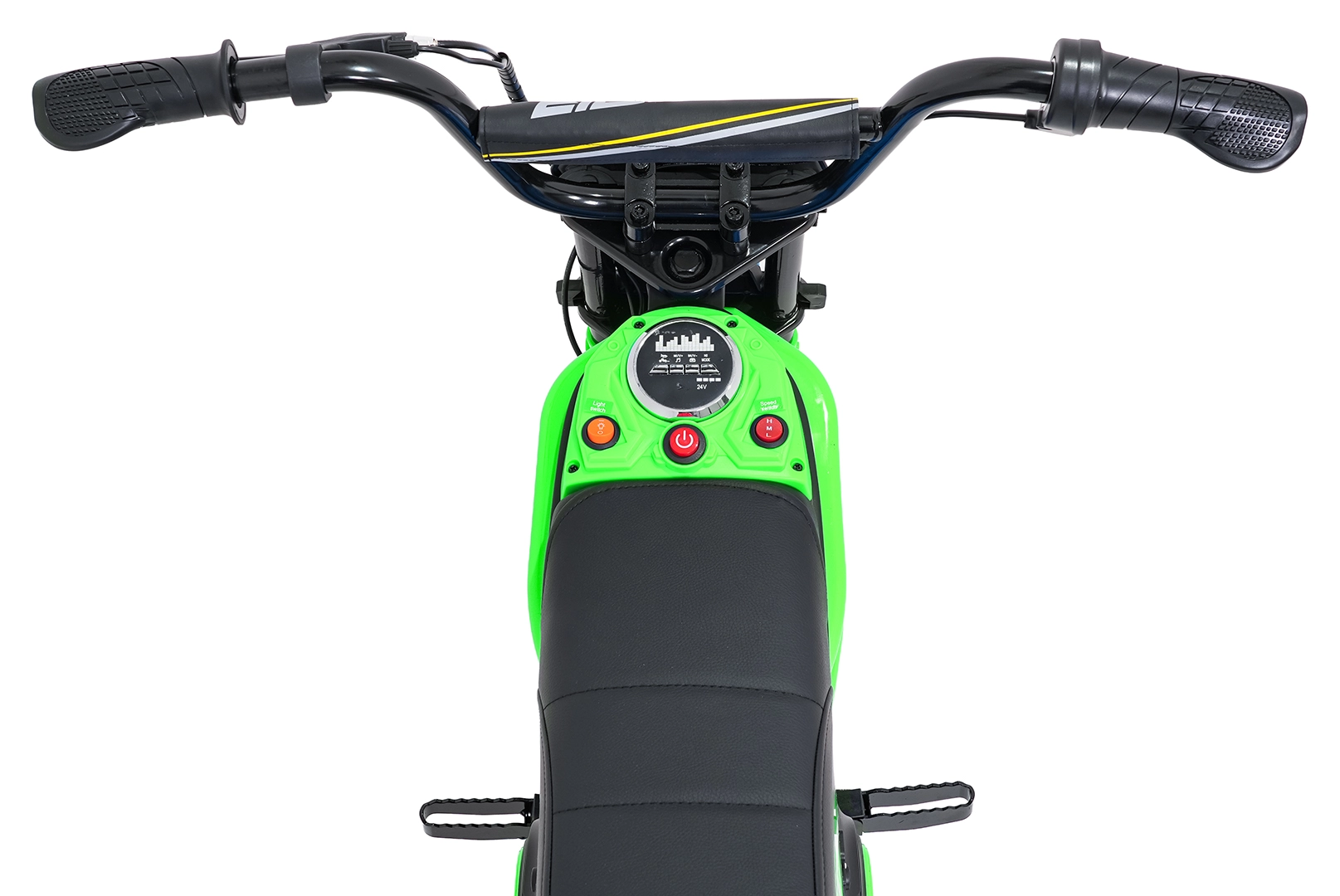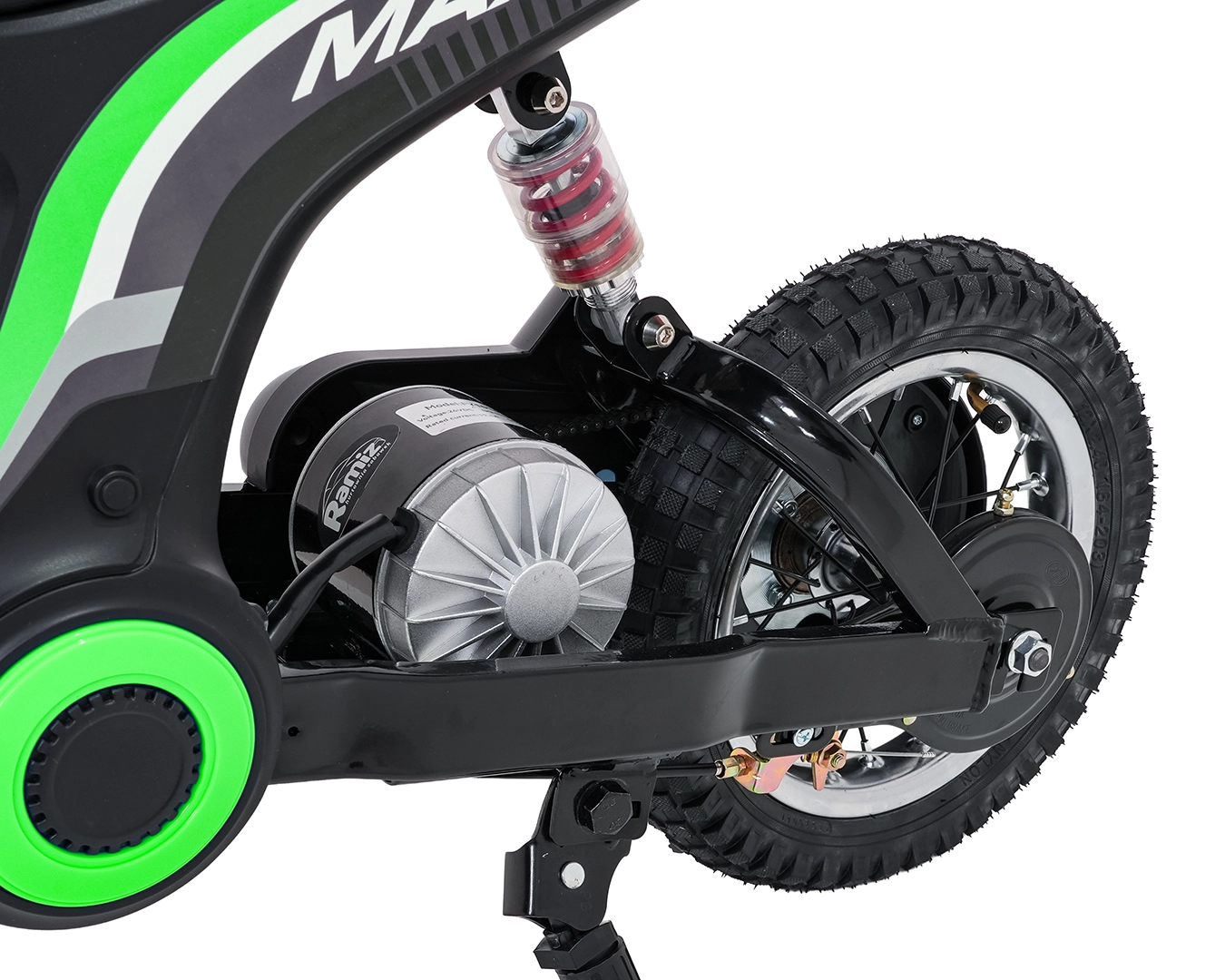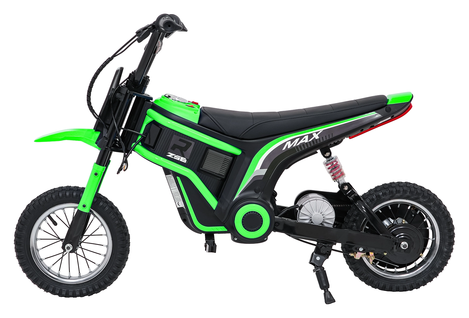 Das elektrische Kinder-Crossbike RZ56 Max in Grün ist ideal für junge Fahrerinnen und Fahrer, die echtes Offroad-Feeling erleben möchten. Dank des leistungsstarken 350W-Motors mit Kettenantrieb und des 24V-Batteriesystems bietet es kräftigen Anzug, sanftes Anfahren und konstante Leistung. Der hintere Stoßdämpfer und die luftgefüllten 30×5 cm Räder garantieren Komfort und Sicherheit auf verschiedenen Untergründen.