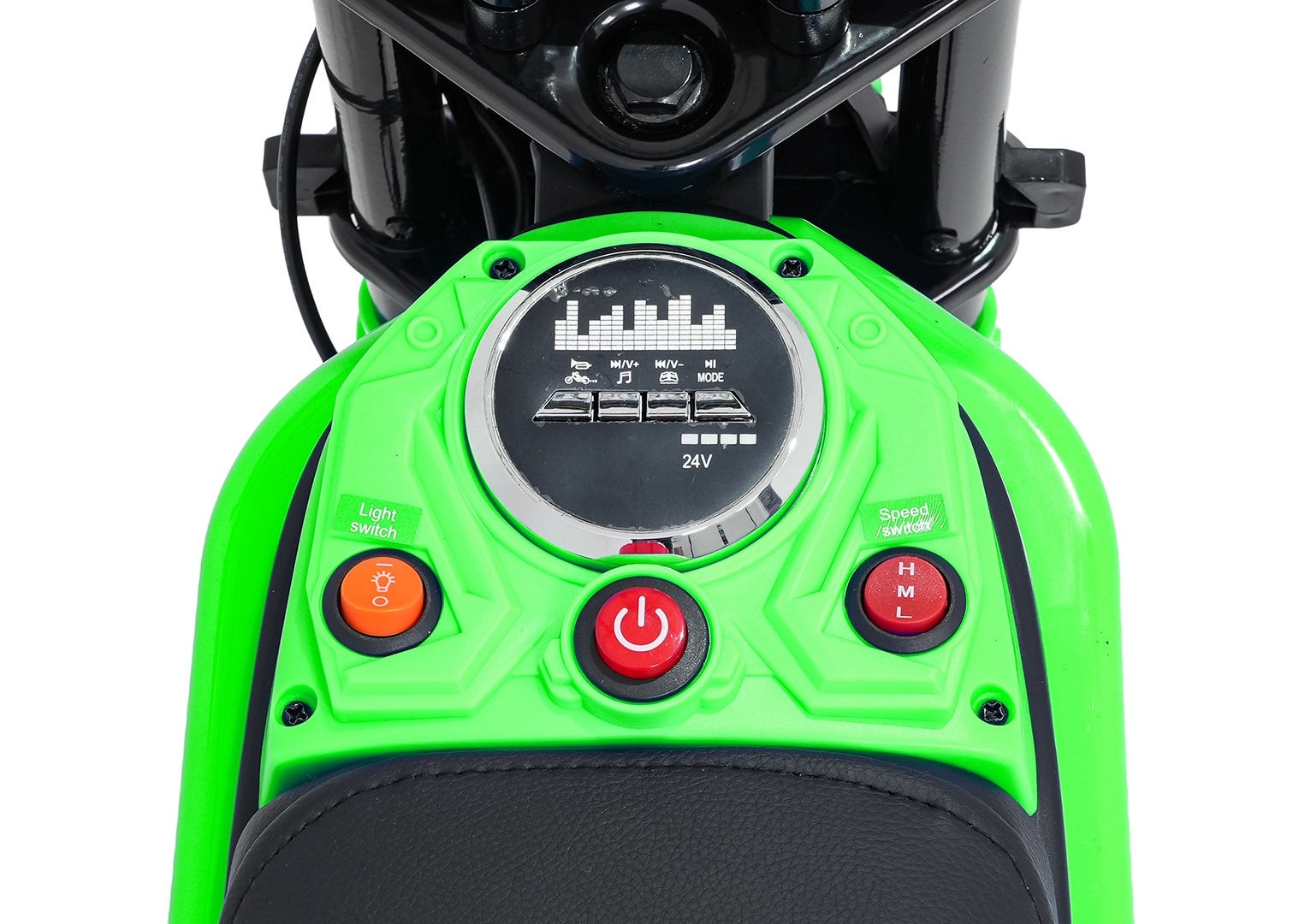 Die Bedienung ist einfach und sicher: Start per Taste, Wahl von 3 Geschwindigkeiten (H/M/L) und gut ablesbare Batterieanzeigen. LED-Lichter erhöhen die Sichtbarkeit, während das Audio-Panel mit Bluetooth, vorinstallierten Melodien, Soundtaste und Hupe für zusätzlichen Spaß sorgt. Die maximale Traglast beträgt 65 kg – das Bike wächst also mit dem Kind mit.