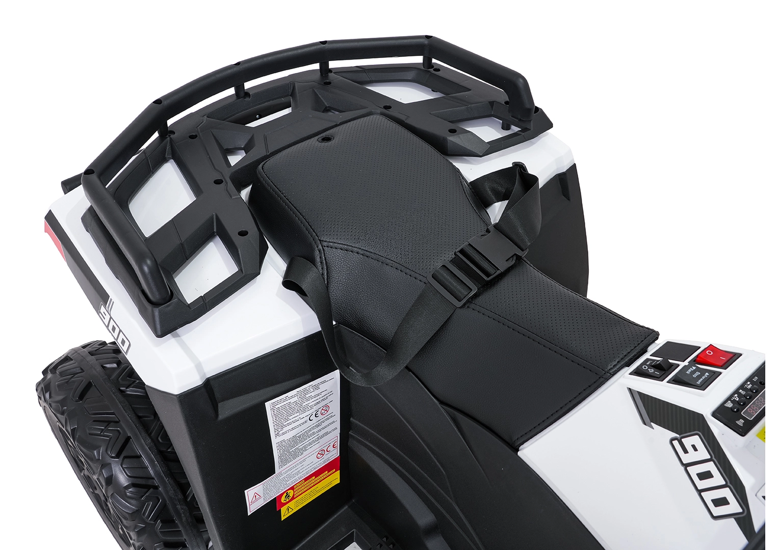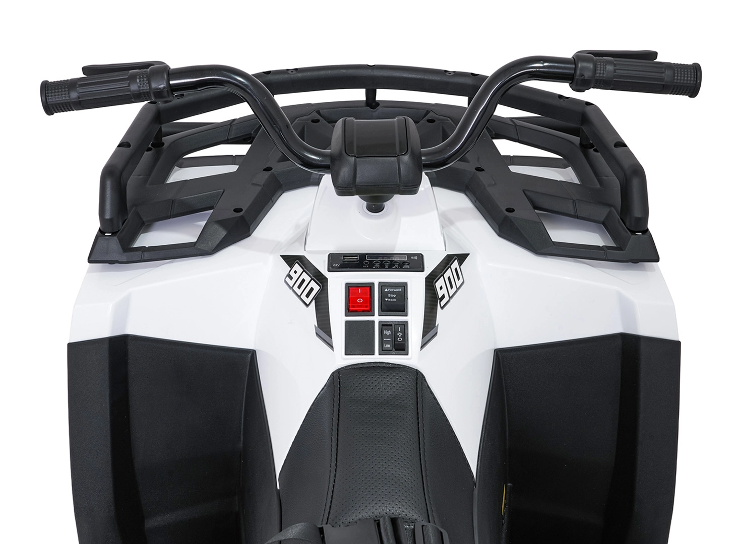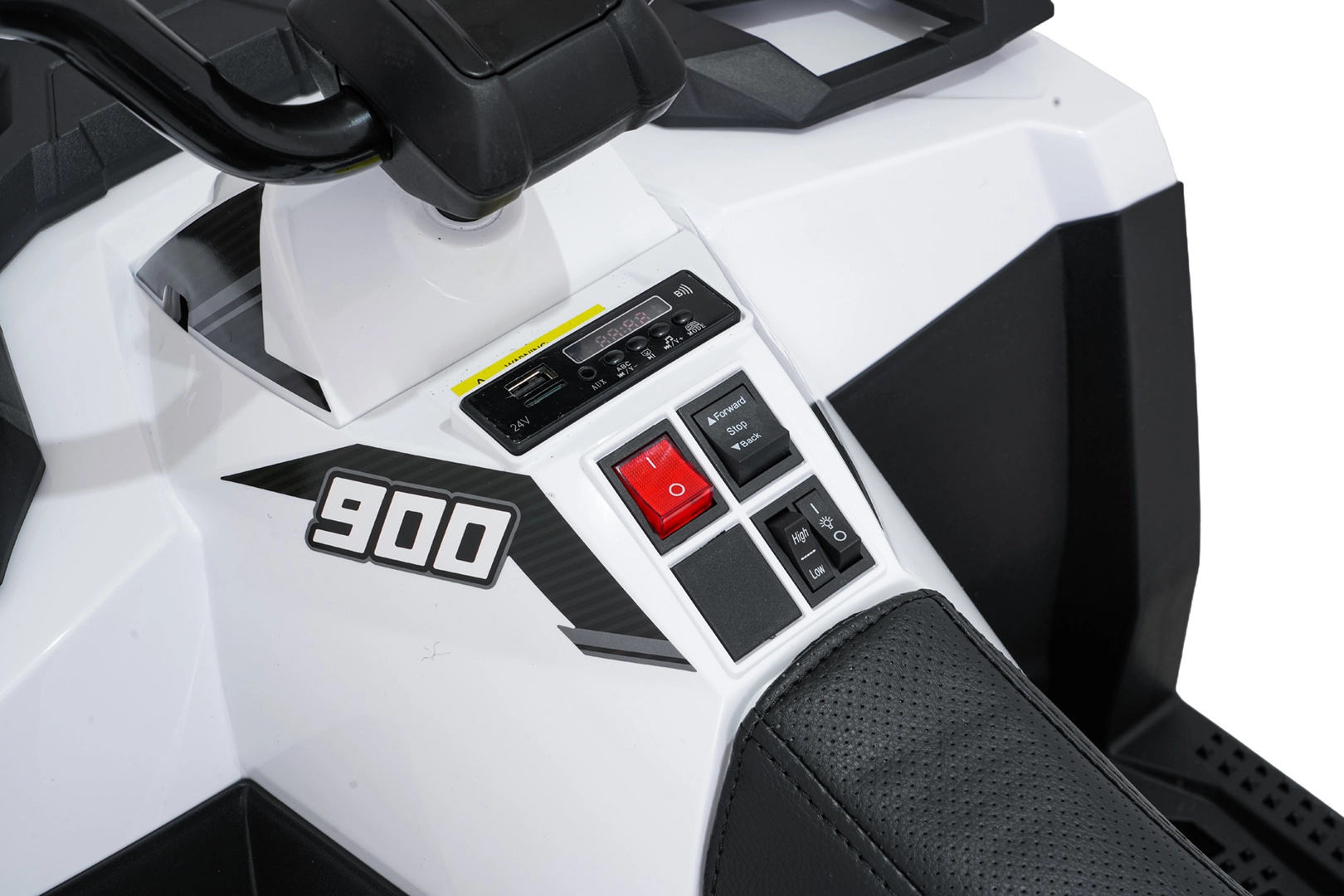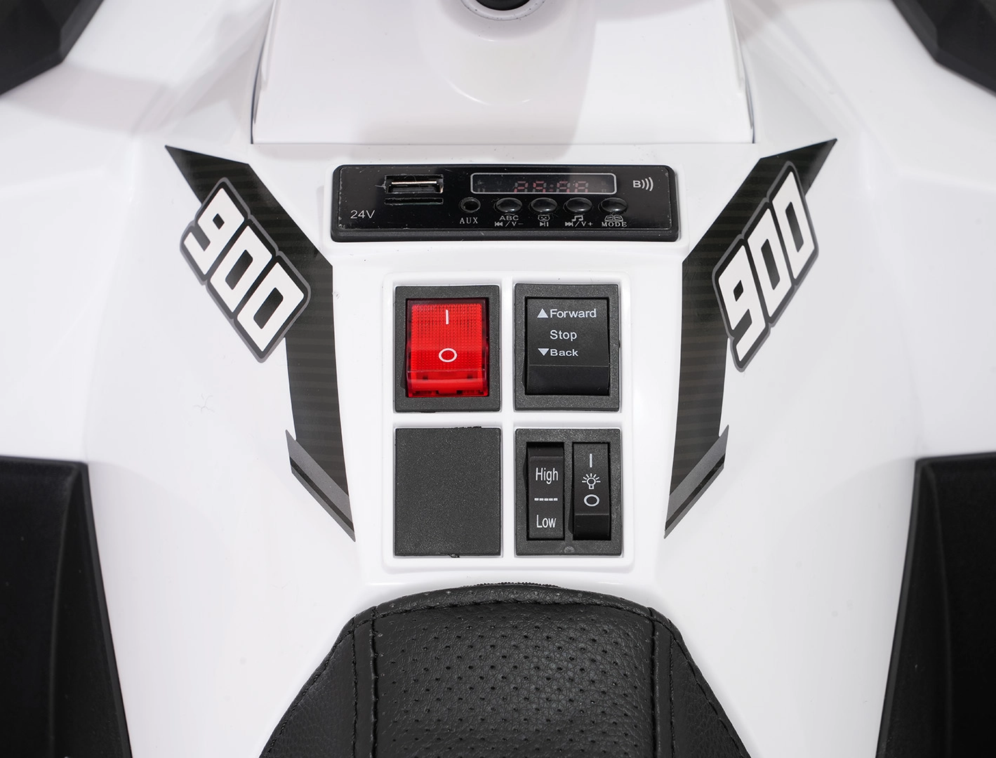 Die intuitive Bedienung wird durch eine praktische 2,4-GHz-Elternfernbedienung mit 3 Geschwindigkeiten und einer Not-Stop-Taste ergänzt. Vordere LED-Scheinwerfer erhöhen die Sichtbarkeit, der gepolsterte Sitz aus Ökoleder mit Sicherheitsgurten sorgt für Komfort und Sicherheit. Das Multimedia-Panel spielt Lieblingssongs über USB, SD, AUX und Bluetooth ab; zudem gibt es integrierte Melodien und eine Ladezustandsanzeige.