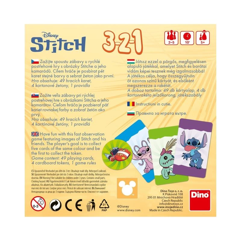 Suchen Sie ein schnelles und leicht verständliches Spiel für unterwegs? Das Reisespiel 3-2-1 STITCH bringt farbenfrohen Spaß mit den beliebten Helden STITCH und Angel. Ziel ist es, so schnell wie möglich fünf Karten derselben Farbe zu sammeln und die Mitspieler zu überholen.