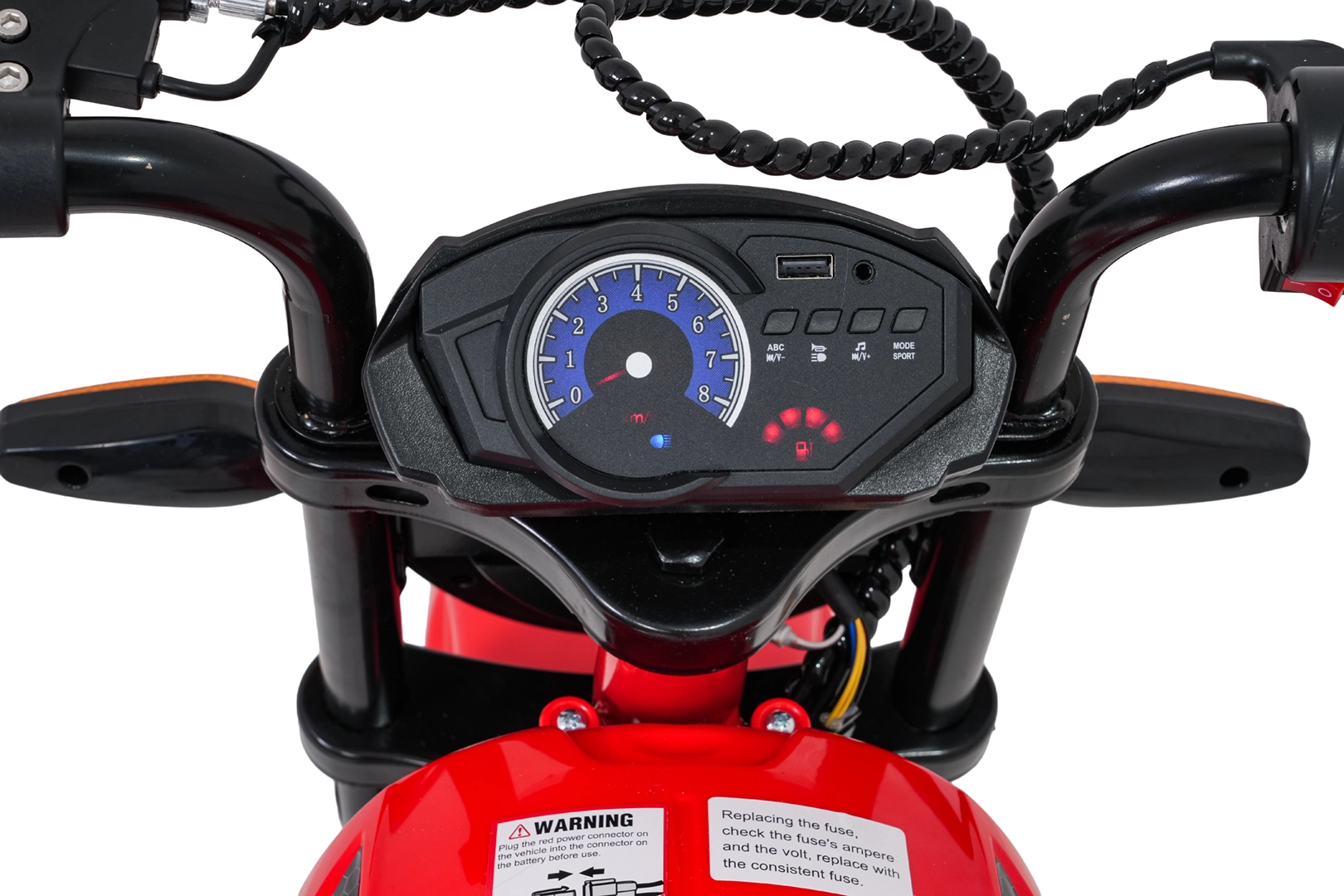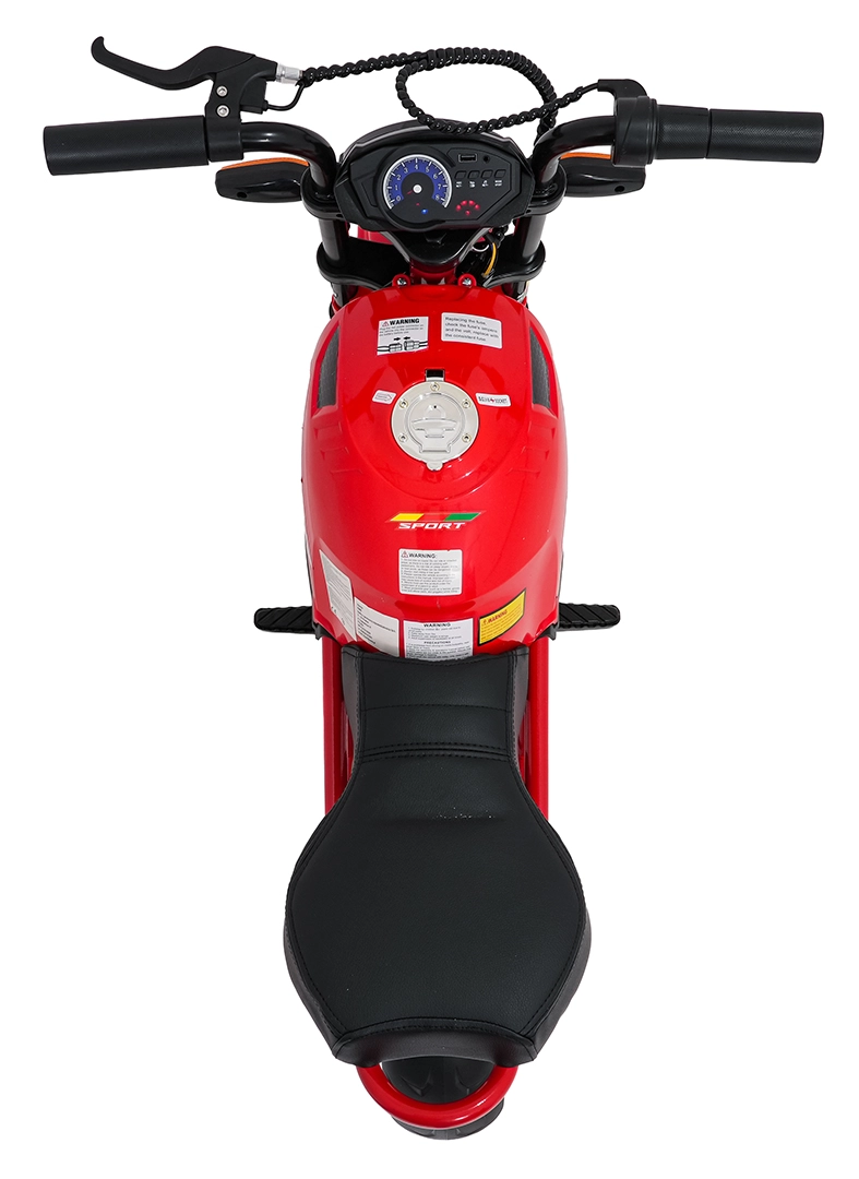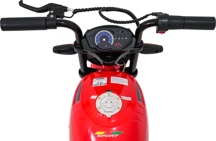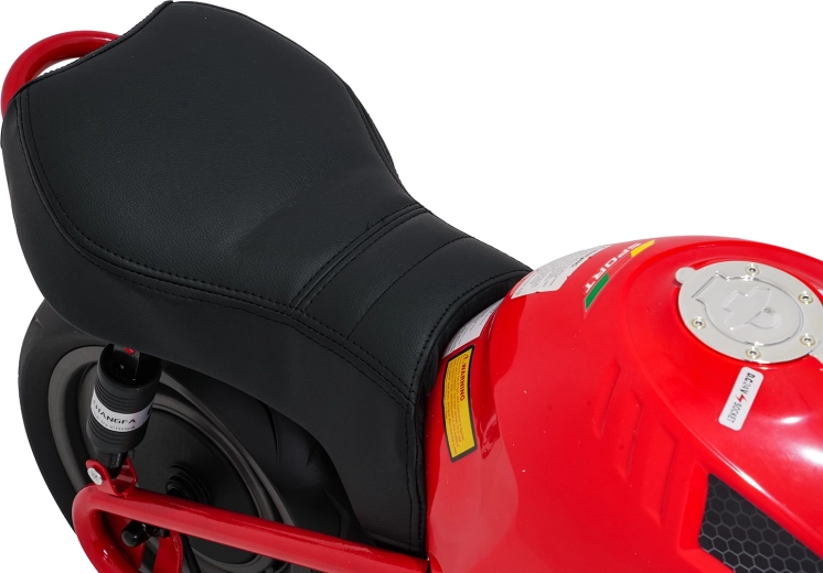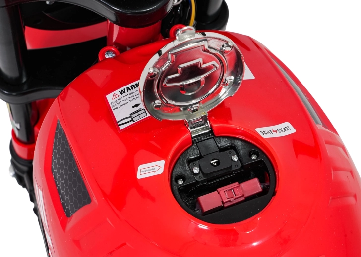 Sicherheit und Stil gewährleisten vordere LED-Lichter, Blinker und ein beleuchtetes Armaturenbrett mit übersichtlichen Anzeigen. Musik und Sounds steuert das Multimedia-Panel mit Bluetooth, MP3, AUX, USB, integrierten Melodien und Hupe. Der Start erfolgt bequem per Knopf, der Sitz aus schwarzem Kunstleder (30×23 cm) sorgt für Komfort.