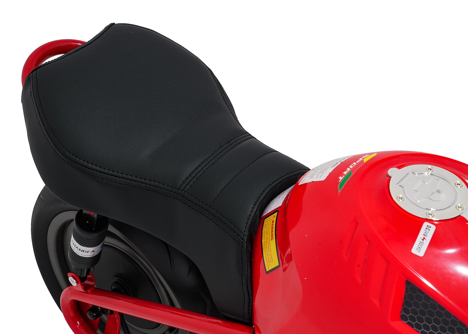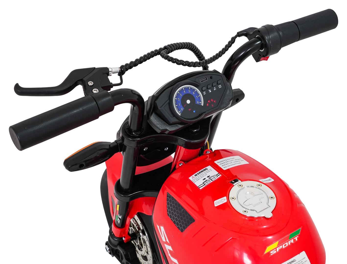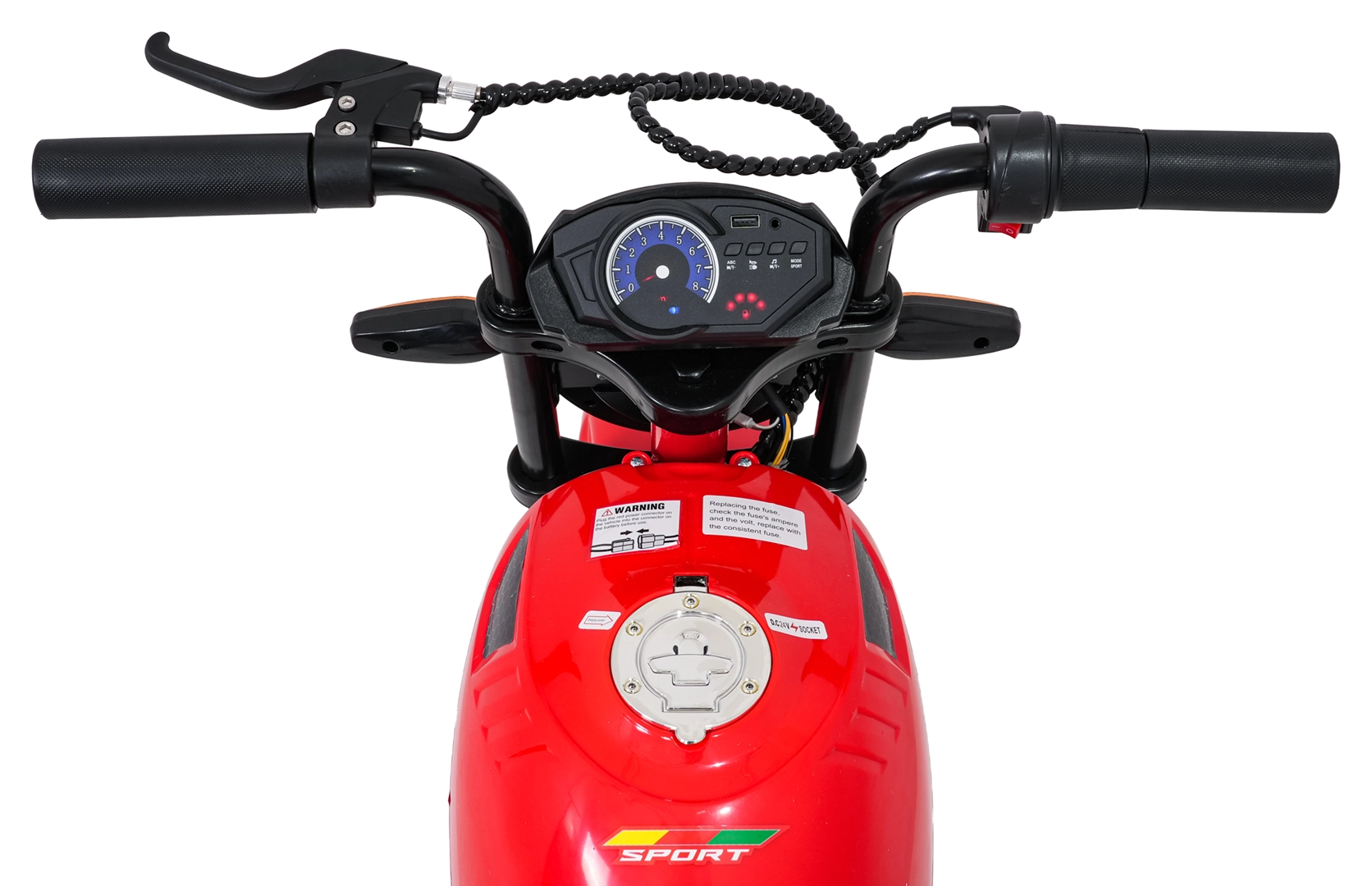Sicherheit und Stil gewährleisten vordere LED-Lichter, Blinker und ein beleuchtetes Armaturenbrett mit übersichtlichen Anzeigen. Musik und Sounds steuert das Multimedia-Panel mit Bluetooth, MP3, AUX, USB, integrierten Melodien und Hupe. Der Start erfolgt bequem per Knopf, der Sitz aus schwarzem Kunstleder (30×23 cm) sorgt für Komfort.