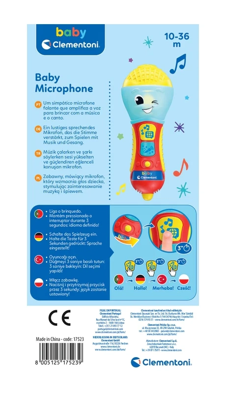 Das sprechende Kinder-Mikrofon CLEMENTONI ist ein großartiges interaktives Spielzeug für kleine Sängerinnen und Sänger. Mit Liedern, Hintergrundmusik und einfachen Sätzen vermittelt es die ersten Buchstaben und neue Wörter in 4 Sprachen. Eine farbige LED-Diode und 2 Funktionstasten sorgen für eine fesselnde Lichtshow und lustige Effekte.