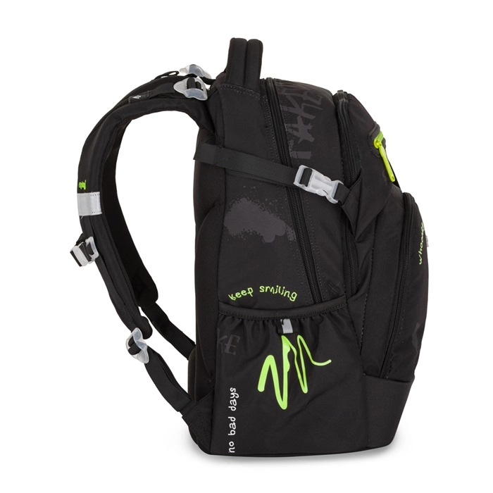 Zwei geräumige Hauptfächer fassen Lehrbücher und Hefte, die Fronttasche ist ideal für die Brotzeit, und die seitlichen elastischen Taschen halten die Trinkflasche sicher.
