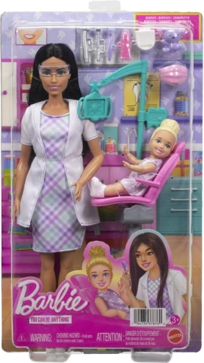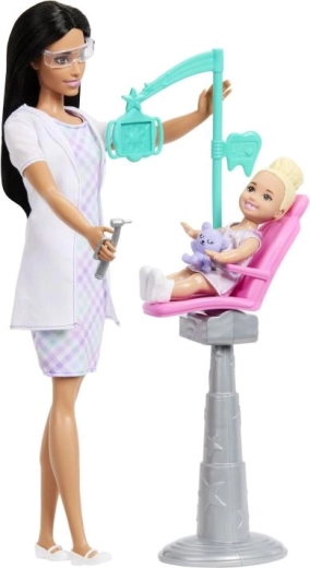 Das Barbie Zahnärztin Spielset inspiriert Kinder, die Welt der Gesundheitsfürsorge und Zahnhygiene zu entdecken. Enthalten sind eine brünette BARBIE-Puppe in elegantem Kleid und Laborkittel, ein kleiner Patient auf dem rosa Stuhl sowie authentische Accessoires wie Instrumente, Becher, Zahnbürste und Zahnpasta. Dank verstellbarem Stuhl und beweglichen Elementen ist das Spiel besonders realistisch.