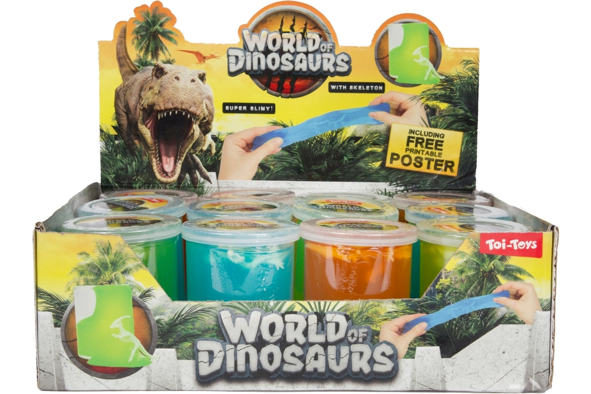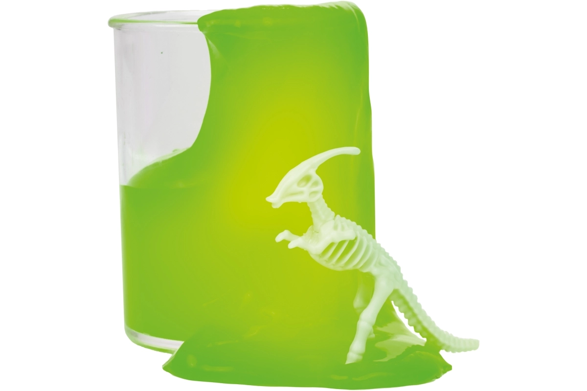 In der Mitte des Schleims wartet eine kleine Überraschung – ein Dinosaurierskelett, das die Neugier weckt und die Spielzeit verlängert.
