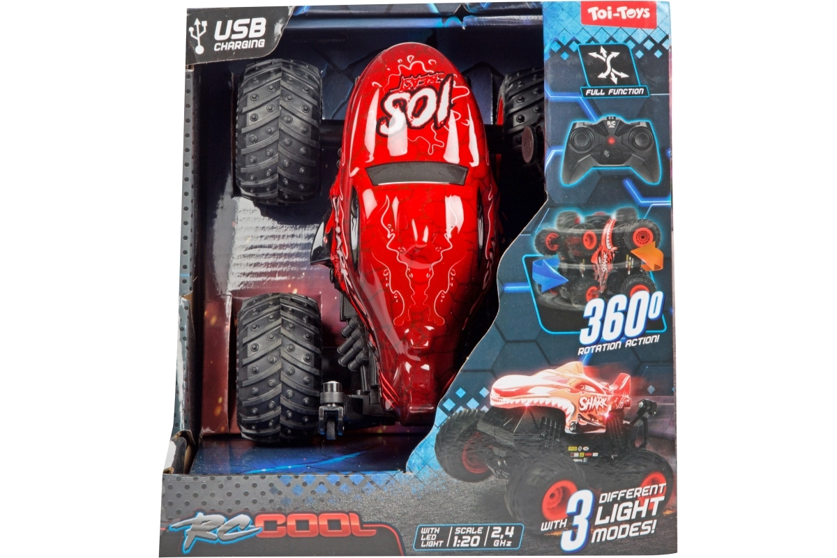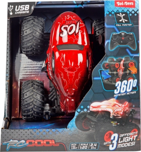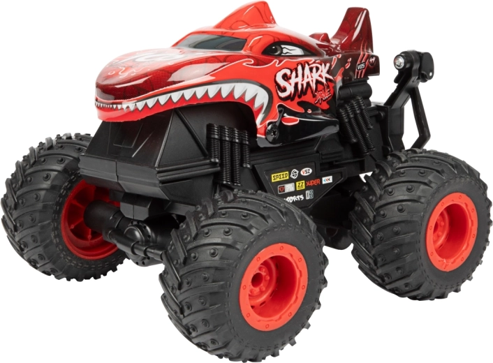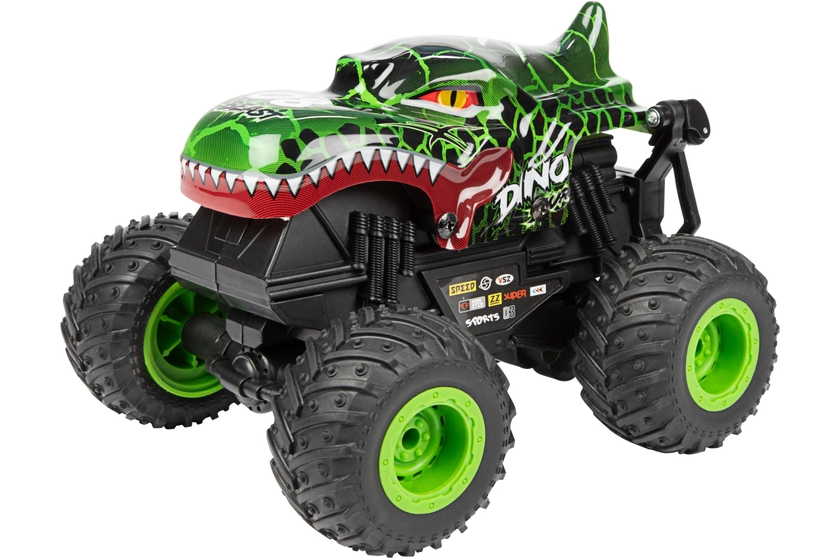 Der Monstertruck besteht aus robustem Kunststoff, hat große profilierte Räder und sichtbare Federung für bessere Stabilität auf unebenem Untergrund. Zwei attraktive Looks (Dinosaurier oder Hai) werden je nach Lagerverfügbarkeit geliefert – beide beeindrucken mit auffälligem Design und solider Ausführung.