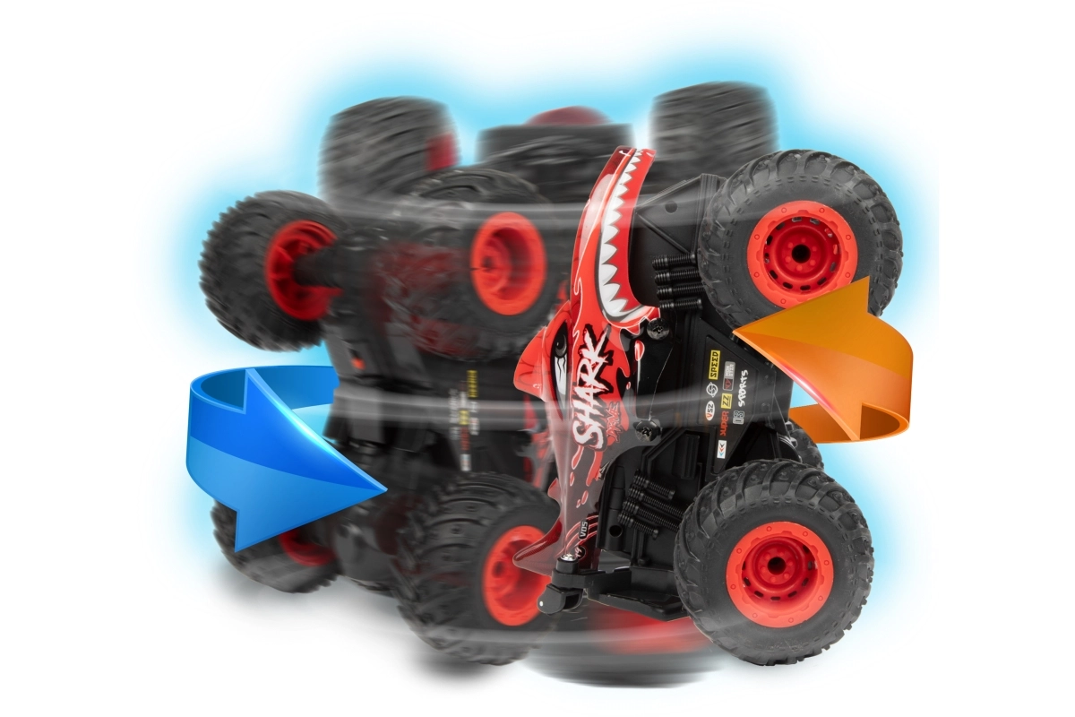 Zwei auffällige Designs (DINO oder Hai) und große Offroad-Reifen für besseren Grip und Stabilität beim Fahren und bei Rotationen.
