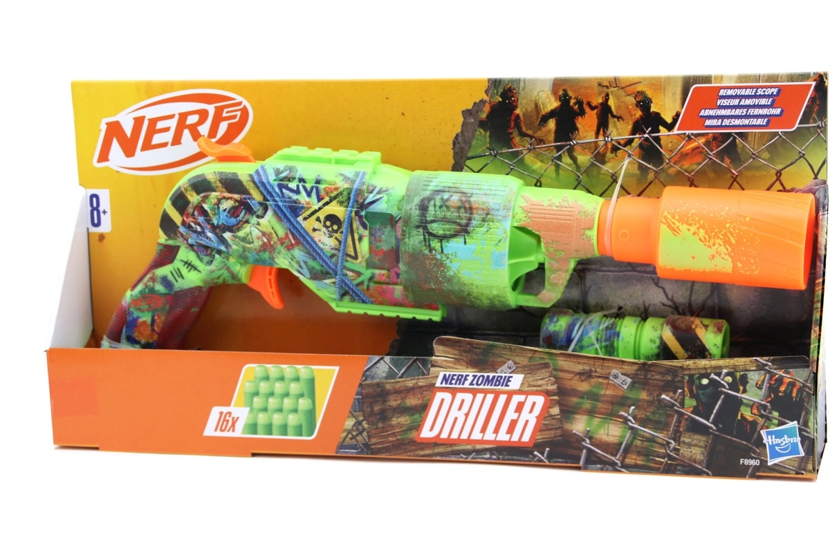 Der Nerf Zombie Driller Blaster bietet einen einzigartigen Look, inspiriert von der Zombie-Welt – er sieht aus wie eine umgebaute Bohrmaschine, bereit für den Kampf. Der fesselnde Graffiti-Print und die verspielten Details machen ihn zum perfekten Begleiter für Themenspiele, Partys und actionreiche Duelle mit Freunden. Das abnehmbare Zielfernrohr hilft beim Zielen und die 16 Darts im Lieferumfang sorgen für jede Menge Spaß.