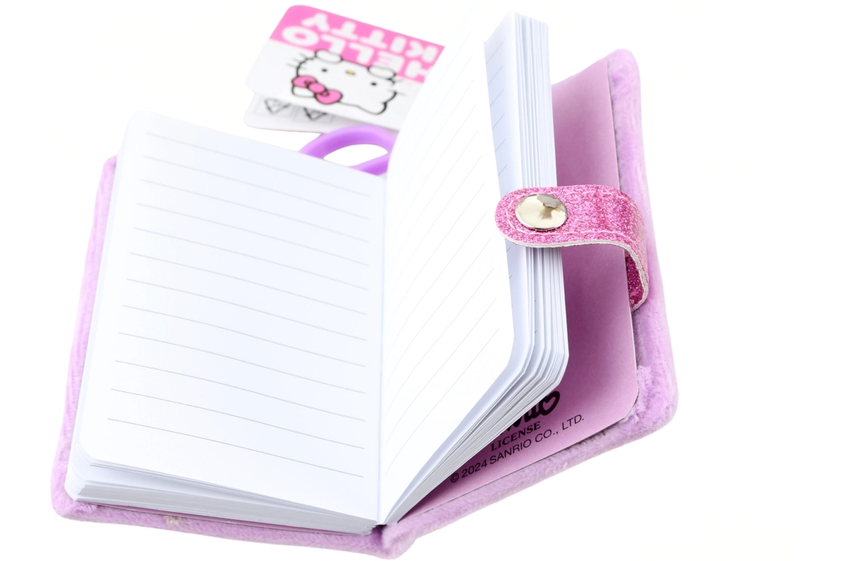 Ein stilvolles und praktisches Accessoire für tägliche Notizen, Listen und geheime Gedanken. Dieses Plüsch-Mini-Notizbuch mit dem ikonischen HELLO KITTY-Motiv wird von Kindern und Erwachsenen gleichermaßen geliebt. Die weiche Oberfläche fühlt sich angenehm an und die niedliche Stickerei verleiht dem Notizbuch einen einzigartigen Look.