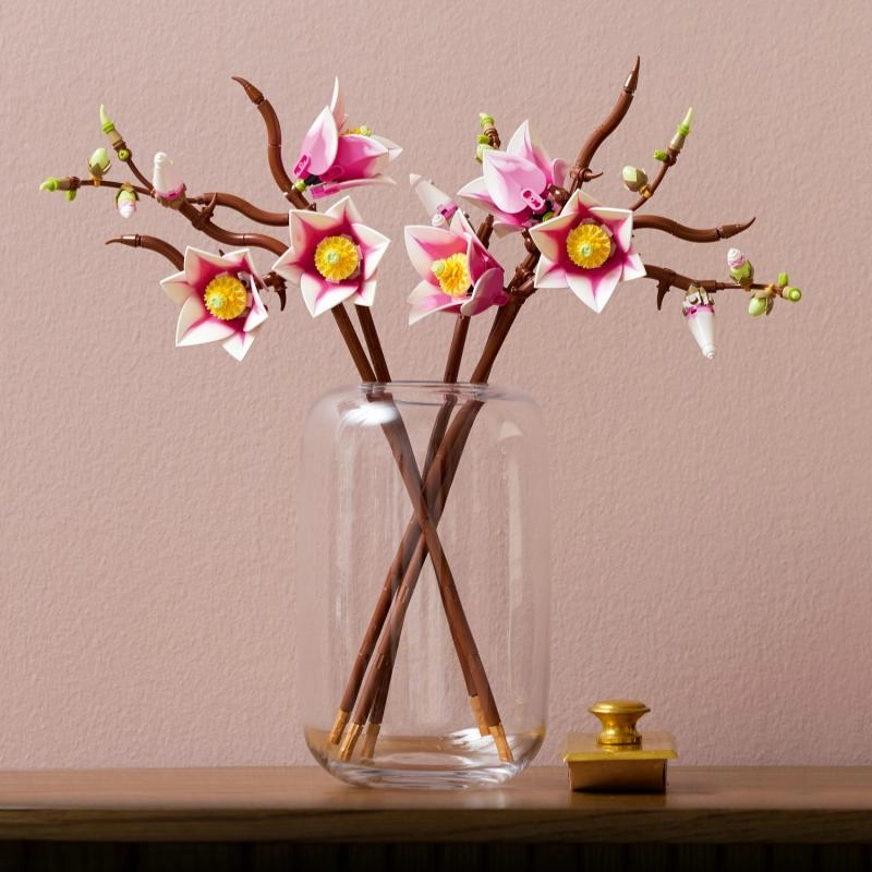 Dieses Design-Set aus der LEGO Botanicals Kollektion begeistert Naturfreunde ebenso wie Liebhaber moderner Innenräume. Fünf Magnolienzweige reichen von kleinen Knospen bis zu voll erblühten Blüten, die sich in einer Vase als lang anhaltende, pflegefreie Blumendekoration präsentieren lassen. Zwei Farbtöne der Blütenblätter verleihen den Blüten authentische Textur und Tiefe.