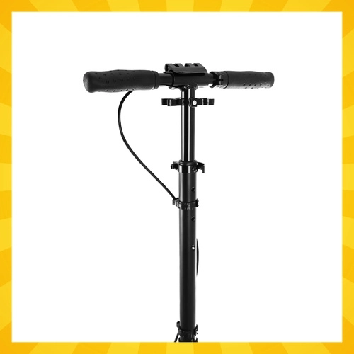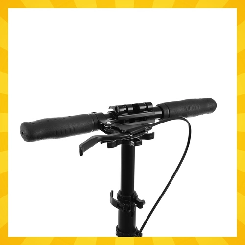 Für sicheres Handling sorgt das doppelte Bremssystem: eine Hand-Scheibenbremse und eine hintere Trittbremse im Schutzblech. Die vierstufige Lenkerhöhenverstellung (84 / 93 / 98 / 103 cm) ermöglicht die Anpassung an Kinder- wie Erwachsenenstaturen. Das rutschfeste Deck und weiche Griffe bieten Halt und Stabilität in jeder Situation, der Parkständer erleichtert das Abstellen.