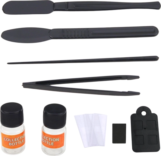 Das Set enthält Objektträger, Deckgläser, Pipette, Pinzette, Spatel, zwei Fläschchen und weiteres Zubehör zur eigenständigen Probenvorbereitung.