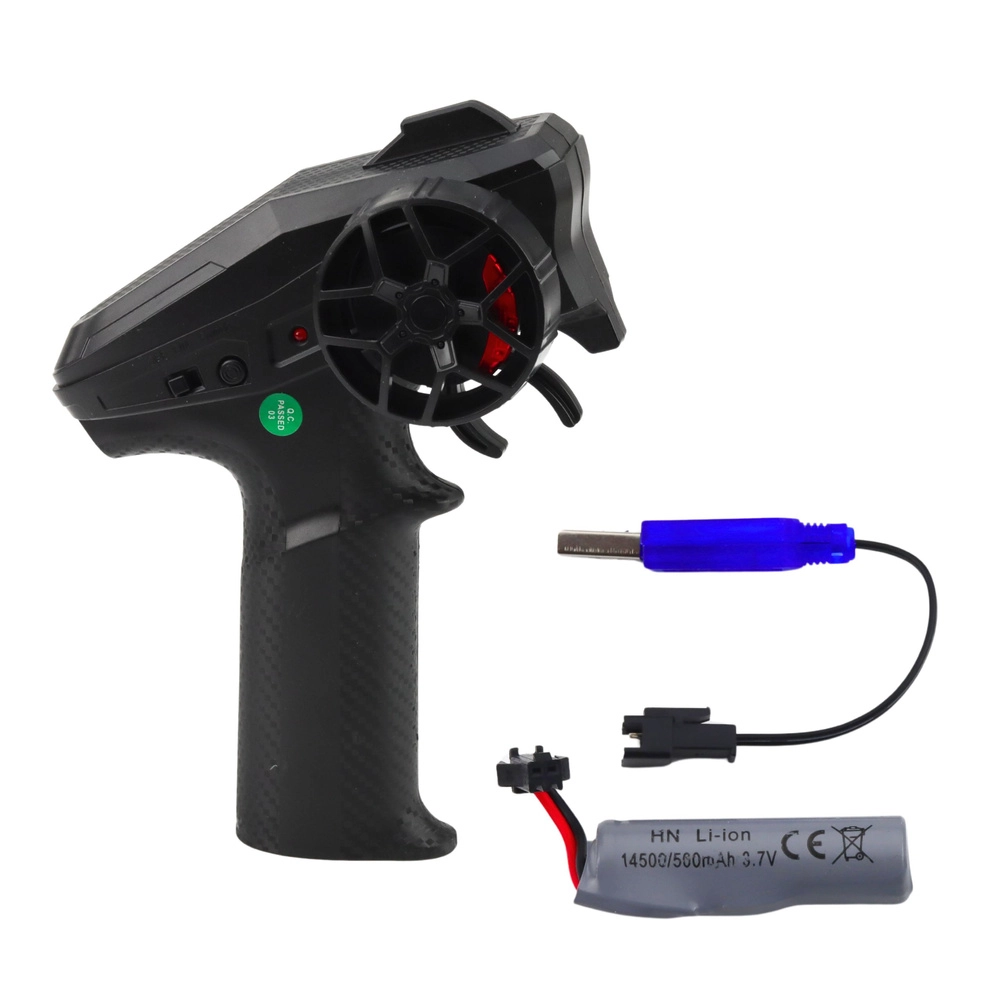 Pistolengriff-Sender mit präziser Steuerung, zuverlässige 2,4-GHz-Frequenz und ein wiederaufladbarer 3,7-V-Li-Ion-Akku für komfortables Fahren ohne Kabel.