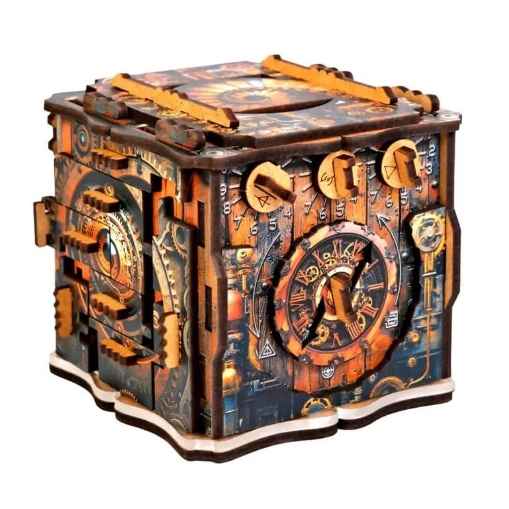 Lösen Sie eine Reihe logischer und mechanischer Schritte und entriegeln Sie einen geheimen Raum für Schmuck, Geld oder eine persönliche Nachricht. Schenken mit Erinnerungswert.