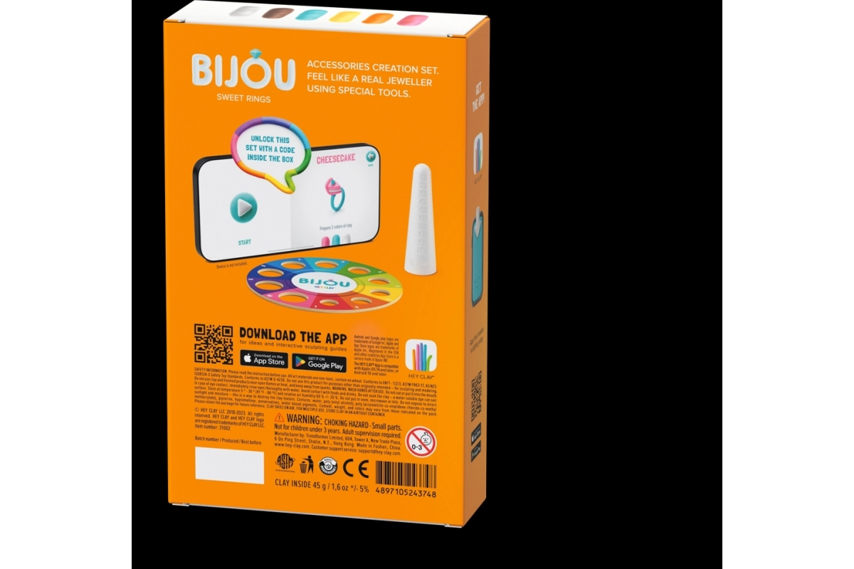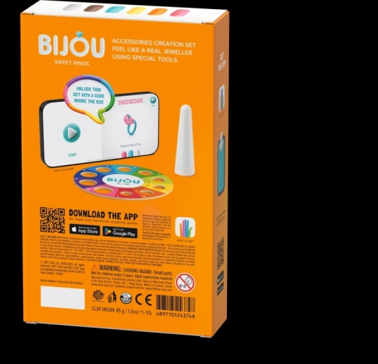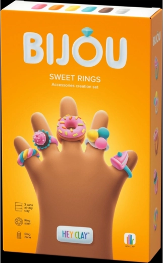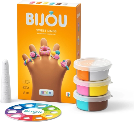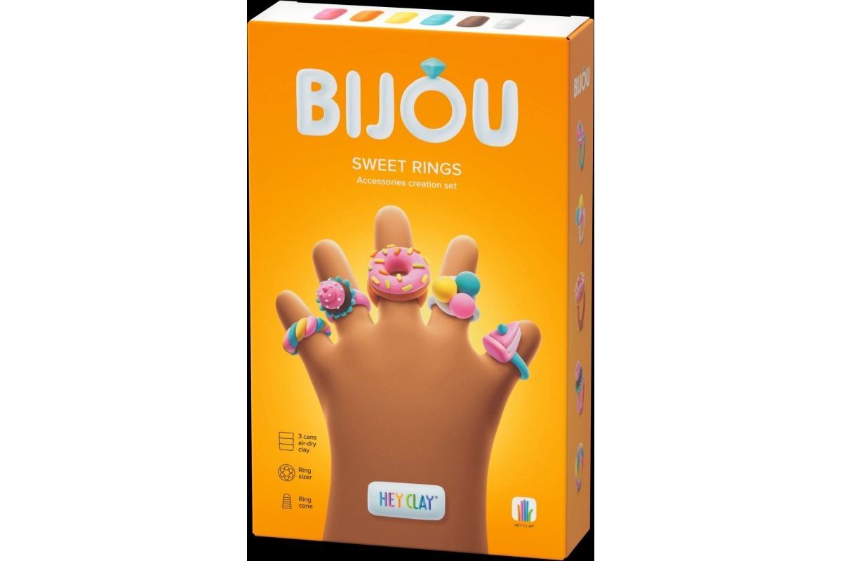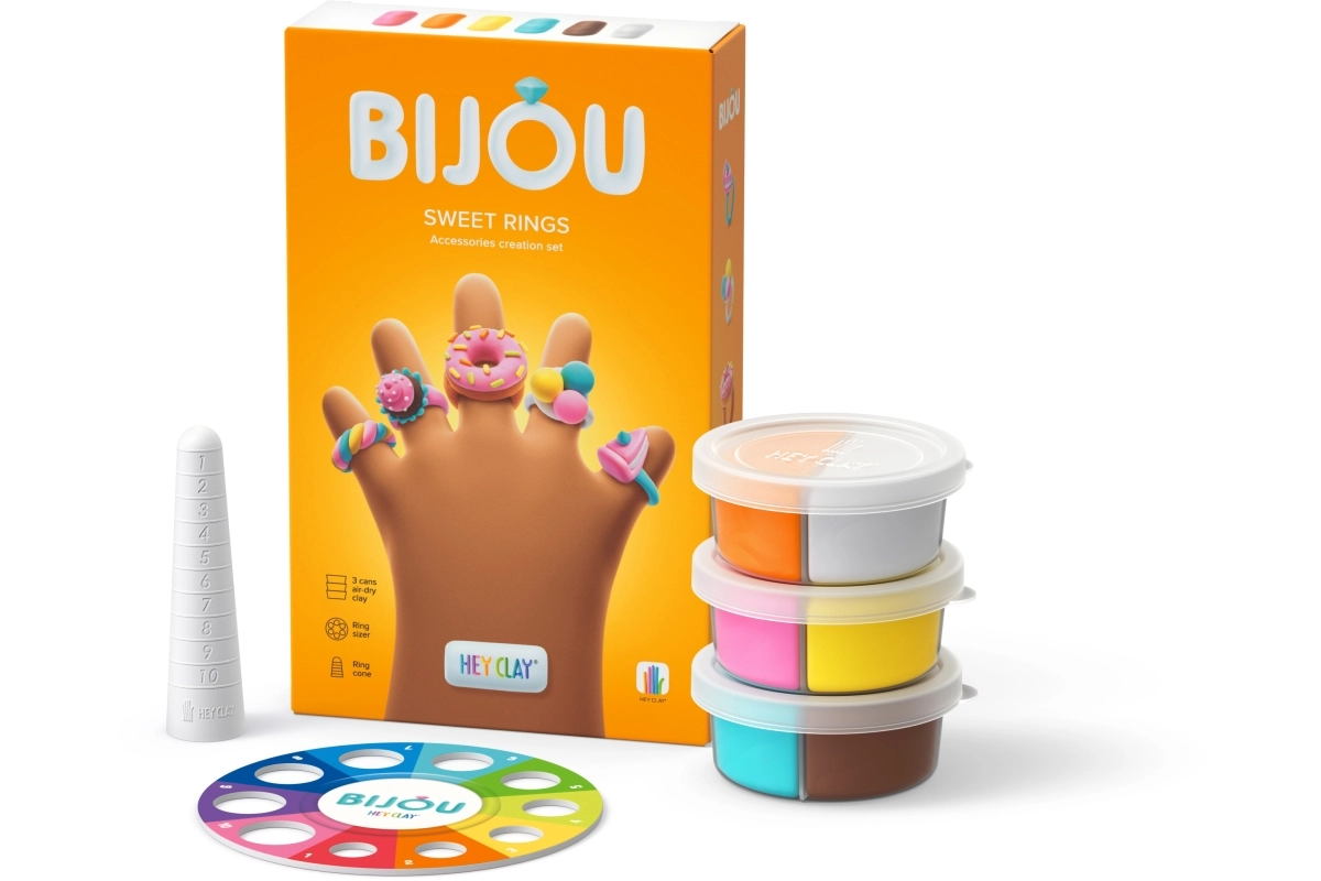 Entdecke verspielte Schmuckgestaltung mit dem HEY CLAY Bijou Set. Dank der leichten und weichen Modelliermasse erschaffen Kinder im Handumdrehen einzigartige, von Süßigkeiten inspirierte Ringe. Das Material trocknet natürlich an der Luft und härtet innerhalb von 24 Stunden aus – das Ergebnis ist ein leichter, aber stabiler Schmuck, den sie stolz tragen können.
