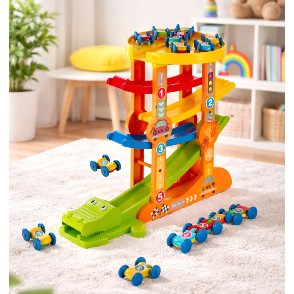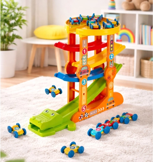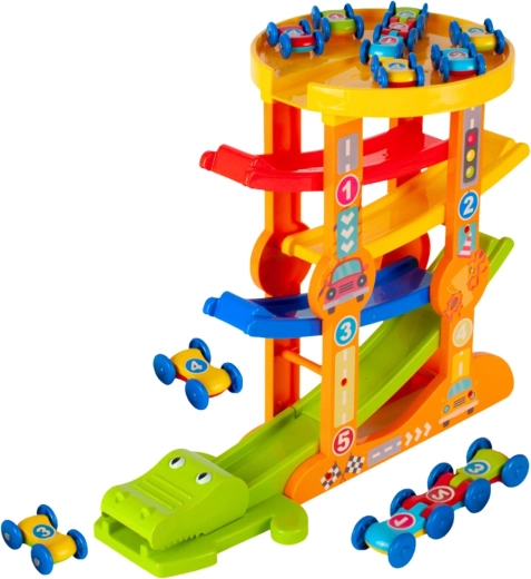 Diese originelle Autorennbahn in Krokodilform macht jede Abfahrt zu einer spannenden Fahrt mit eindrucksvollem Finale. Die Autos sausen über 5 Etagen, beschleunigen in den Kurven und am Ende wartet ein Katapult mit öffnendem Krokodilmaul. Beim Spielen verinnerlichen Kinder ganz natürlich die Prinzipien von Bewegung, Geschwindigkeit und Gravitation.