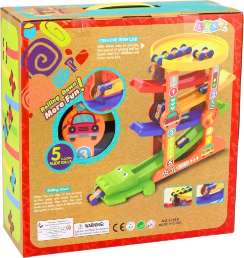 Jede Ebene hat eine andere Farbe und die Autos sind zweifarbig. Dank der nummerierten Kennzeichnung der Ebenen und Fahrzeuge üben Kinder spielerisch Farben und erste Zahlen. Im Set ist außerdem ein spezieller „Zug“ aus drei verbundenen Autos enthalten, der noch schneller hinabsaust und in den Kurven einen attraktiven Effekt erzeugt.