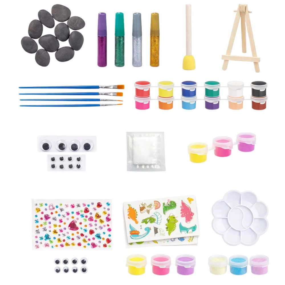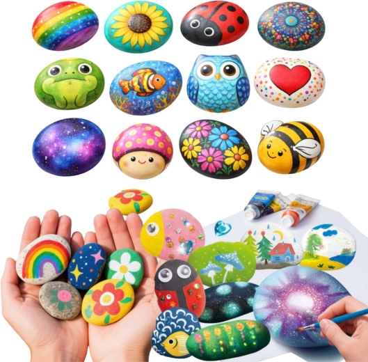 Dieses vielseitige Set bietet alles, was Kinder zum Bemalen und Verzieren glatter Steine brauchen – von Acrylfarben über Pinsel und Schwämmchen bis hin zu glitzernden Extras. Nach dem Aufladen leuchten die Kunstwerke dank phosphoreszierender Farben sanft und werden zu einer magischen Deko fürs Kinderzimmer.