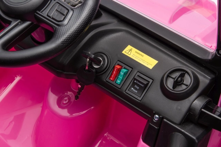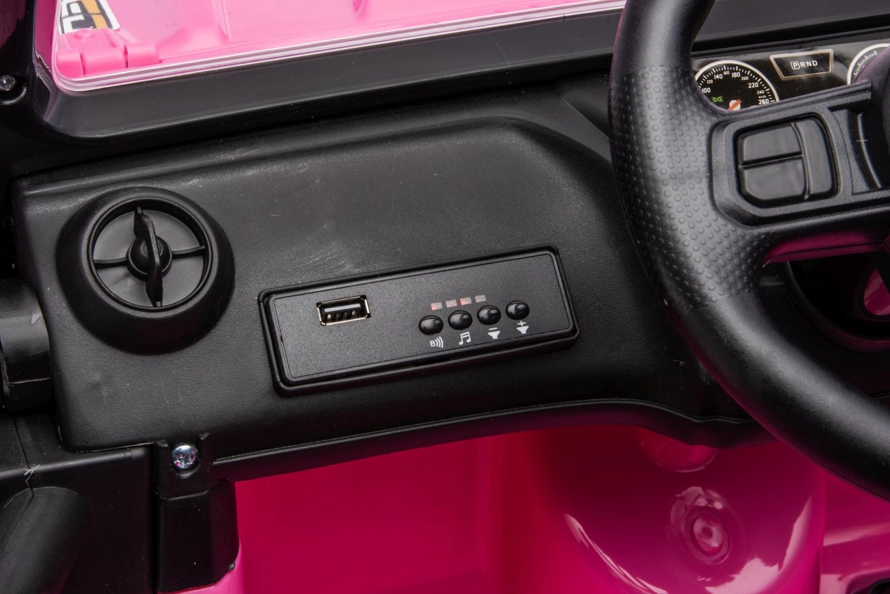 Ein Audio-Panel mit MP3, Bluetooth, USB und FM-Radio, Sounds und Hupe am Lenkrad sorgt für Fahrspaß. Der praktische hintere Kofferraum verstaut Kleinigkeiten für den Ausflug. Die integrierte Ladezustandsanzeige informiert über den Akkustand.