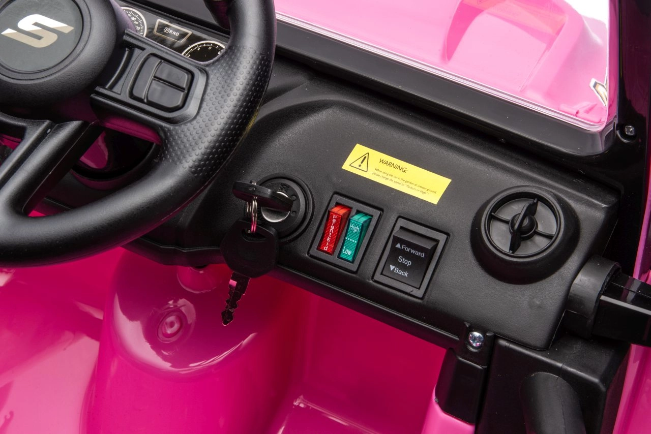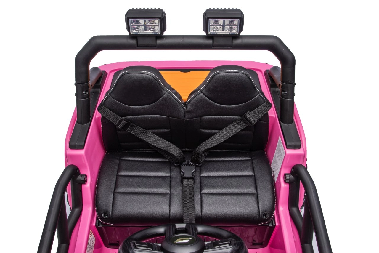 Eltern behalten dank der 2,4-GHz-Fernbedienung mit 3 Geschwindigkeiten und der Sicherheitstaste Stopp die volle Kontrolle. Kinder freuen sich über öffnende Türen, realistische LED-Scheinwerfer und eine obere Lichtleiste (batteriebetrieben). Der Zweisitzer aus Ökoleder mit Sicherheitsgurten erhöht Komfort und Sicherheit.