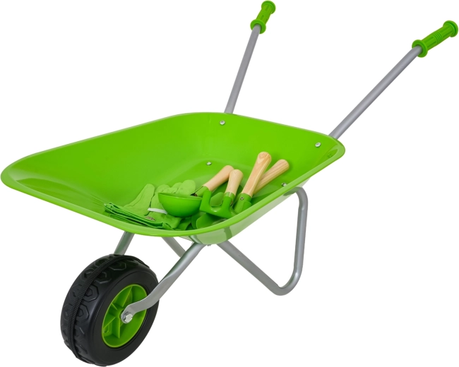 Komplettes Garten-Set für Kinder ab 3 Jahren mit grünem Schubkarrenrad, robusten Metallwerkzeugen und bequemen Handschuhen. Kinder können sicher graben, lockern und Erde transportieren und bei der Gartenarbeit mithelfen. Edelstahl-Aufsätze mit Holzgriffen und einfache Montage sorgen für Langlebigkeit und komfortable Nutzung.