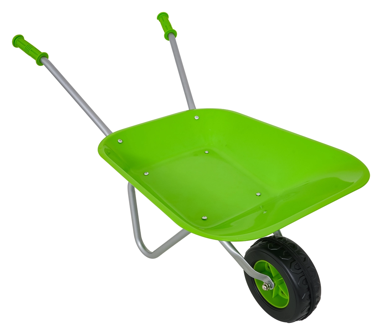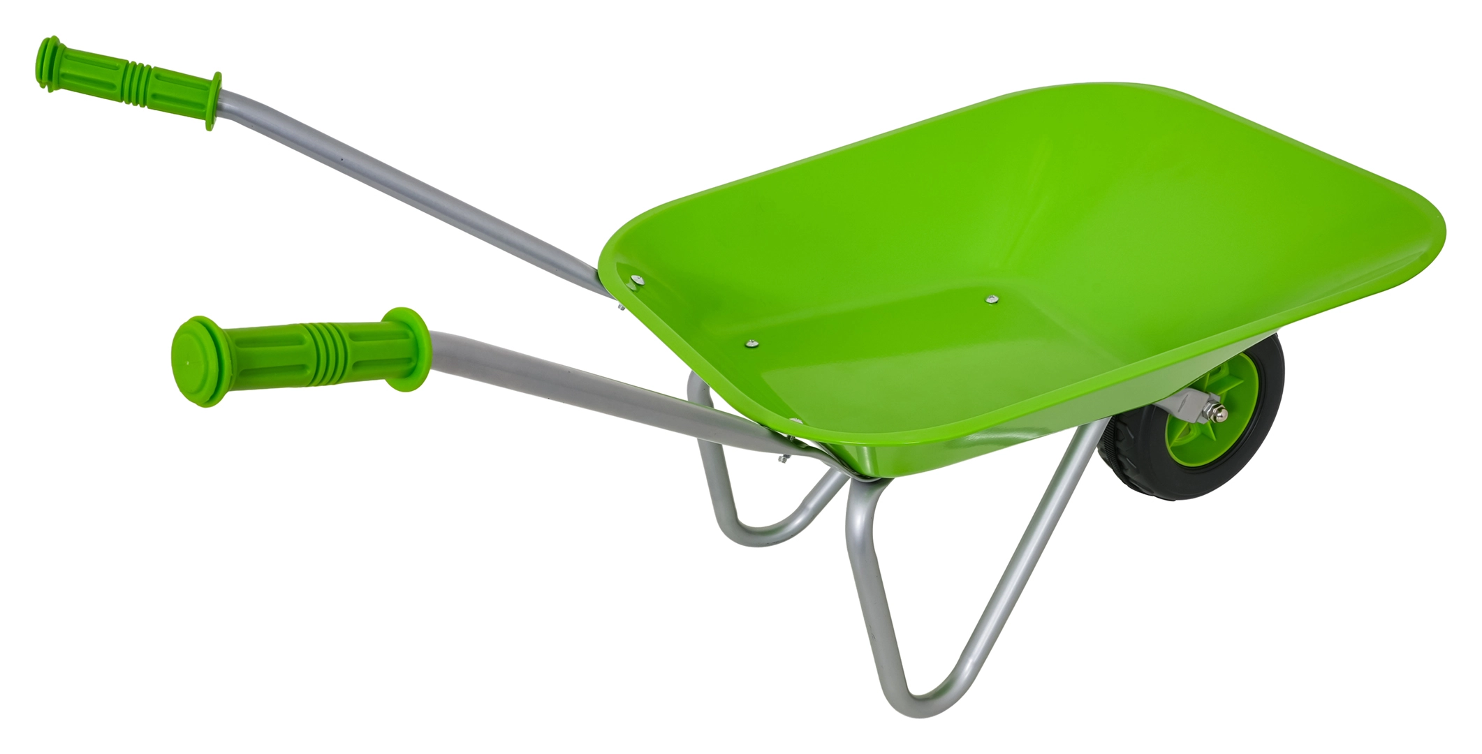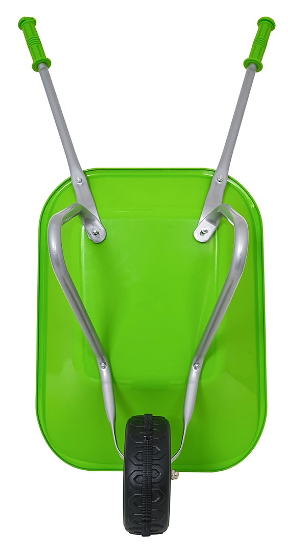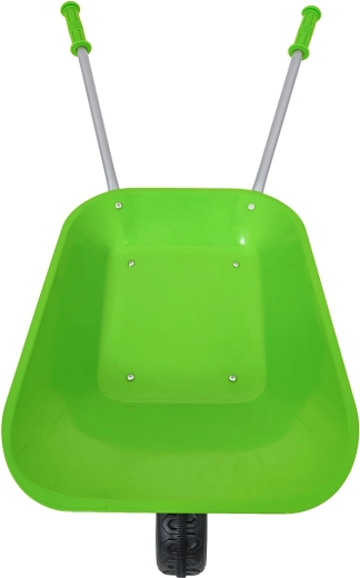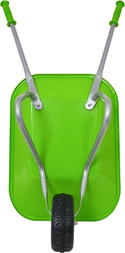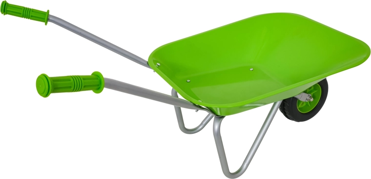 Leichte und stabile Kinderschubkarre mit breiter Mulde und einem Rad meistert Erde, Laub und kleines Werkzeug. Ergonomische Griffe mit rutschfesten Auflagen erleichtern die Handhabung.