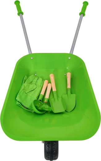 Fördern Sie Neugier und Geschicklichkeit Ihrer Kinder mit einem Set, das alles für die ersten Schritte im Gärtnern bietet. Die robuste grüne Schubkarre und vier hochwertige Handwerkzeuge ermöglichen kleinen Helfern das Graben, Schaufeln und Harken von Erde, das Umpflanzen von Pflanzen und den Materialtransport. Enthalten sind außerdem Kinderhandschuhe zum Schutz der Hände.