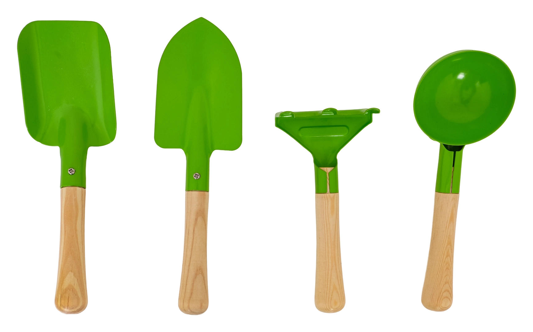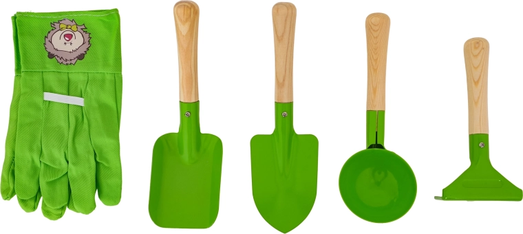 Das Set enthält eine Schaufel, einen spitzen Pflanzspaten, eine runde Sandschaufel und einen kleinen Rechen. Stabile Metallköpfe und glatte Holzgriffe sorgen für Komfort und lange Lebensdauer.