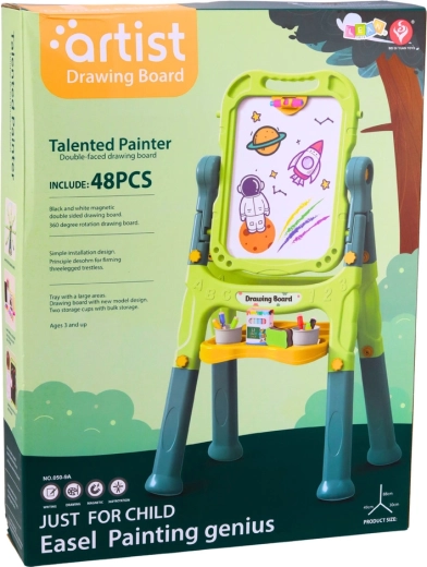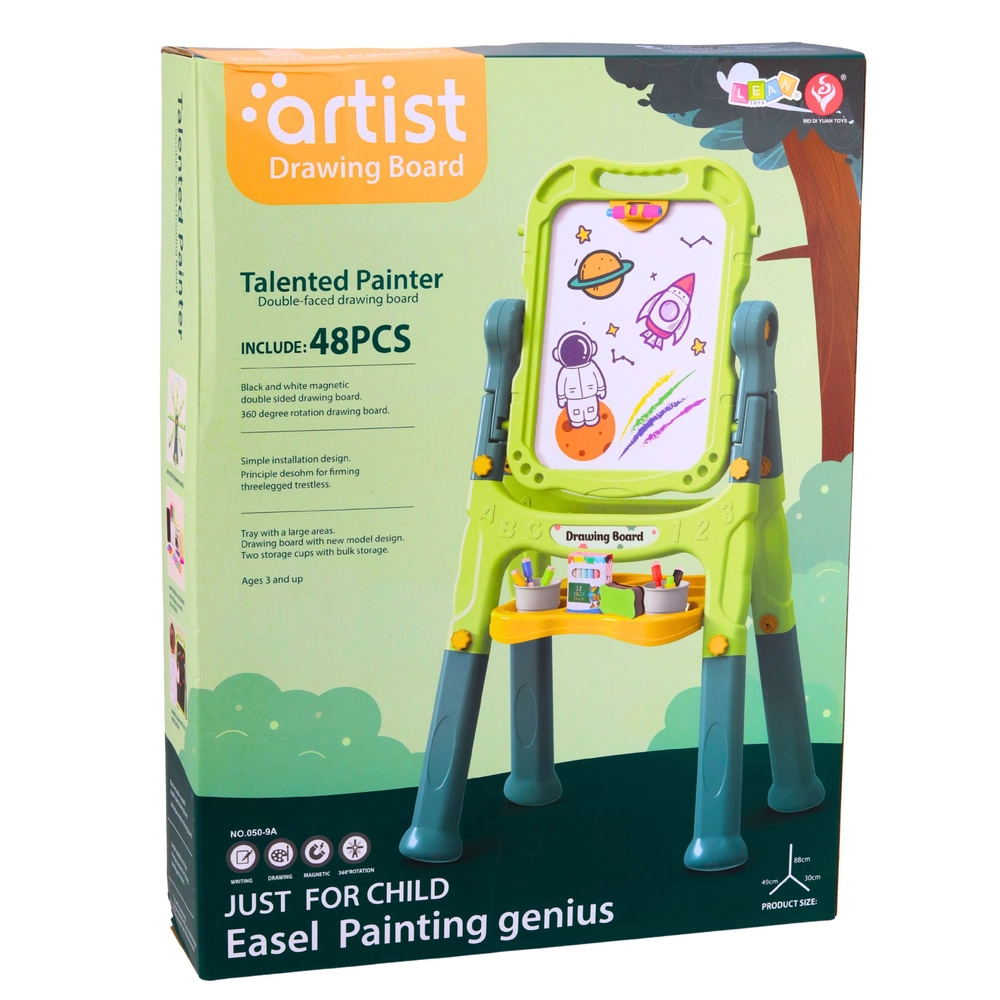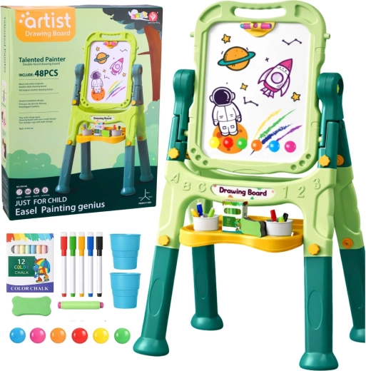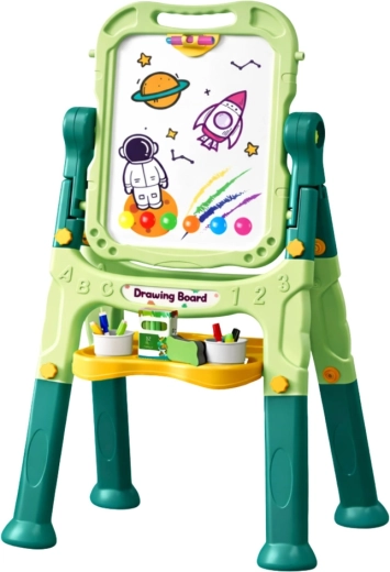 Fördern Sie Kreativität und Lernen durch Spielen. Die doppelseitige Kindertafel bietet zwei Arbeitsflächen – eine weiße, magnetische, trocken abwischbare Seite zum Schreiben mit Markern und eine schwarze Kreideseite für klassisches Zeichnen mit Kreide. Der stabile Ständer mit praktischer Ablage für Zubehör hält alles griffbereit, während der 360°-Drehmechanismus ein schnelles Wechseln zwischen den Seiten ermöglicht.