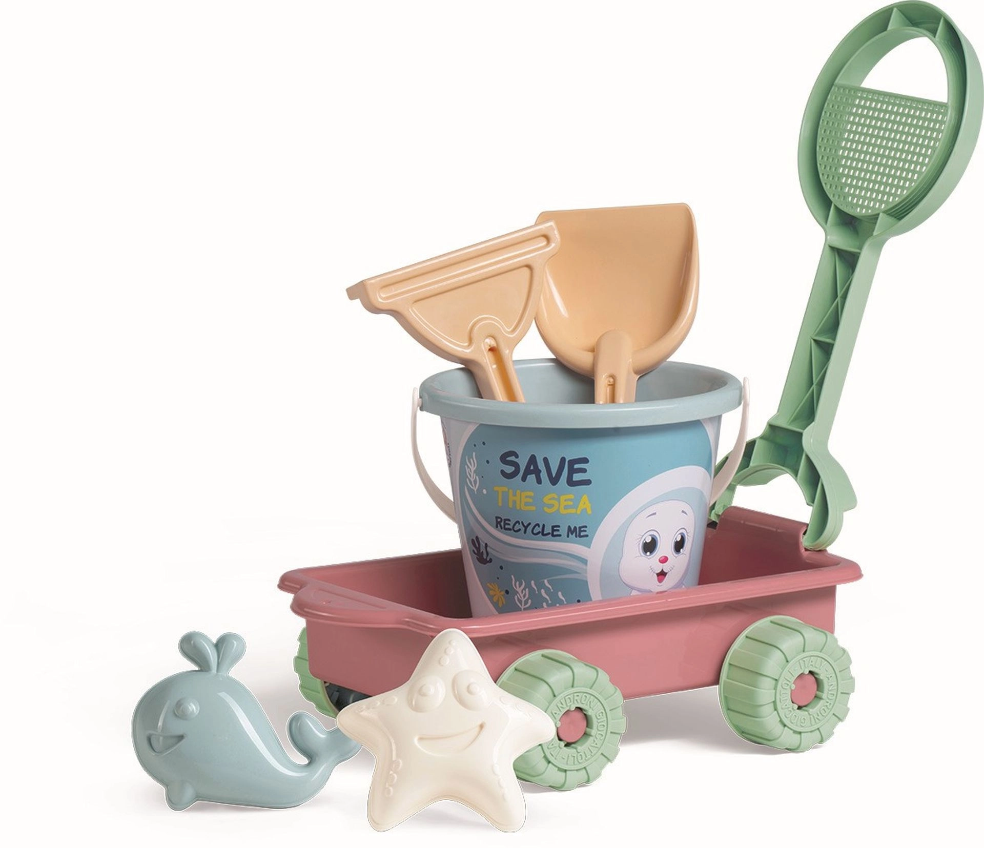 Dieses praktische Sandspiel-Set in sanften Pastellfarben fördert kreatives Spielen und die Entwicklung der Feinmotorik. Der Wagen mit Griff erleichtert den Transport von Sand und Spielzeug, und das Griffende dient als Sieb für noch mehr Spielspaß. Eimer, Schaufel und Harke sind leicht und haben abgerundete Kanten für eine sichere Anwendung.
