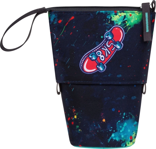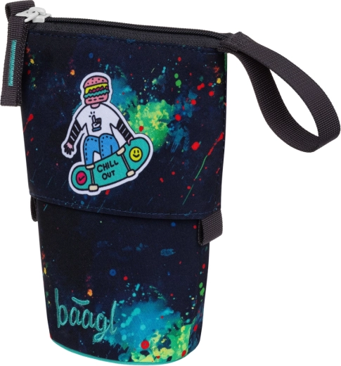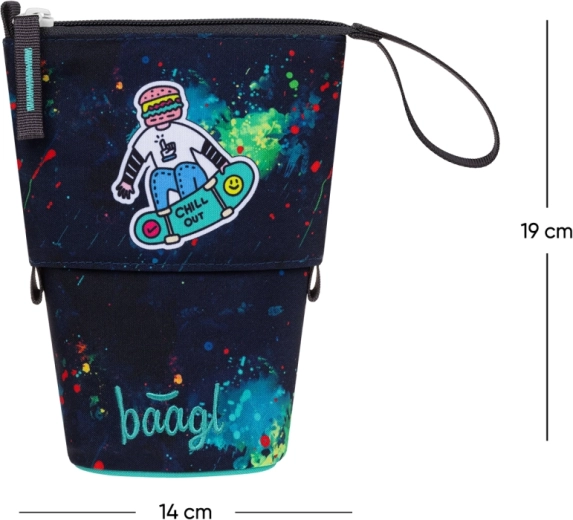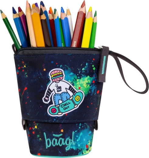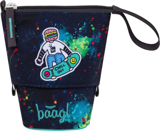 Entdecken Sie ein durchdachtes Mäppchen, das sich in Sekundenschnelle in einen übersichtlichen Ständer verwandelt. Dank des robusten und wasserabweisenden Materials behält es seine Form, schützt Stifte und Marker und sorgt für einfache Organisation für Kinder und Eltern. Modernes Design mit Aufnäher „CHILL OUT“ und farbigen „Splatters“ verleiht jedem Schultisch Stil.