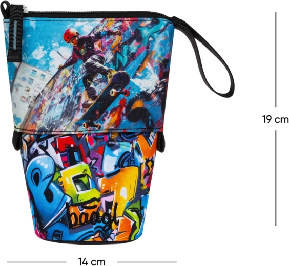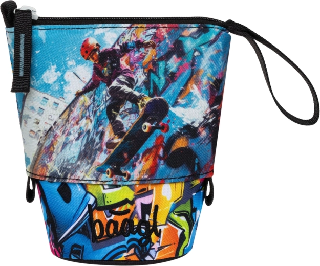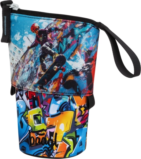 Das Federmäppchen wird verantwortungsvoll hergestellt und trägt die Global Recycled Standard (GRS)-Zertifizierung, was die Verwendung von mindestens 50 % recycelten Materialien sowie die Erfüllung hoher sozialer und ökologischer Anforderungen bestätigt. Es verbindet Nachhaltigkeit, Funktionalität und ein attraktives Graffiti-Design mit Skateboarder.