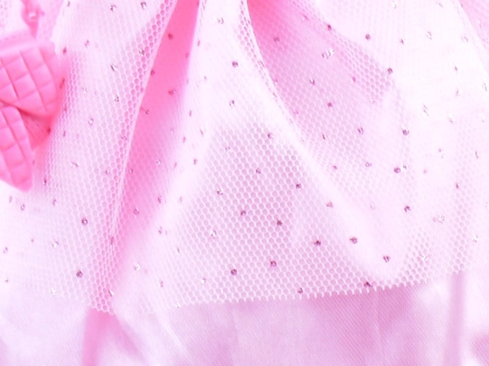Das lange rosa Kleid mit Details und passenden Schuhen verwandelt Anlily in eine echte Prinzessin, bereit für den Ball.