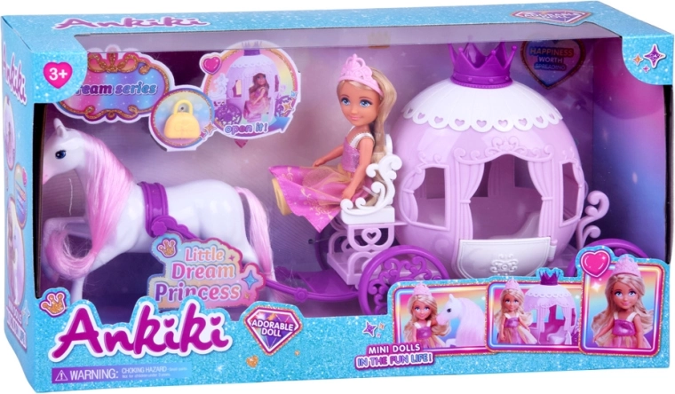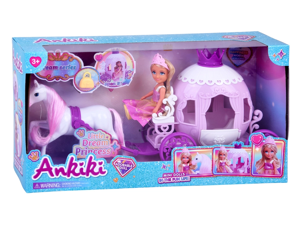 Dieses bezaubernde Set bietet alles für eine magische Fahrt ins Reich der Fantasie: eine kleine Prinzessin im rosa Kleid mit Krone, eine verzierte Kutsche mit Krone und Herzchen-Details und ein weißes Pferd mit rosa Mähne und Schweif. Dank der kompakten Maße können Kinder es überallhin mitnehmen.