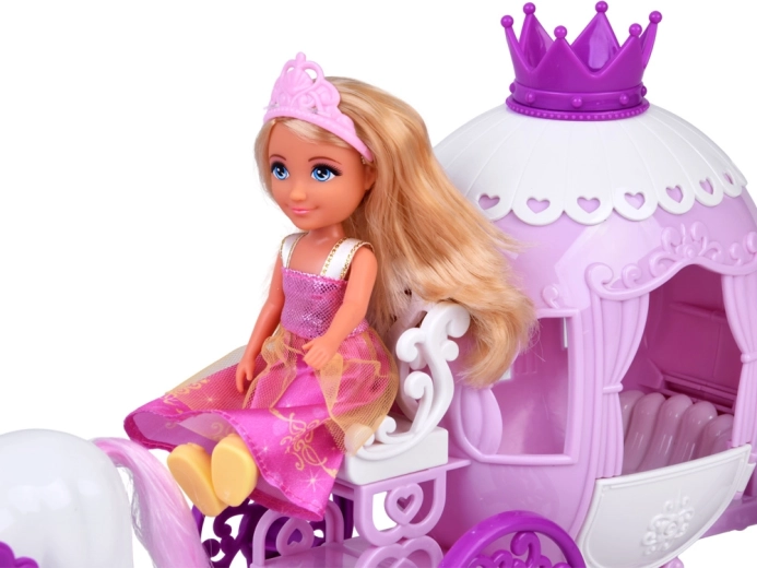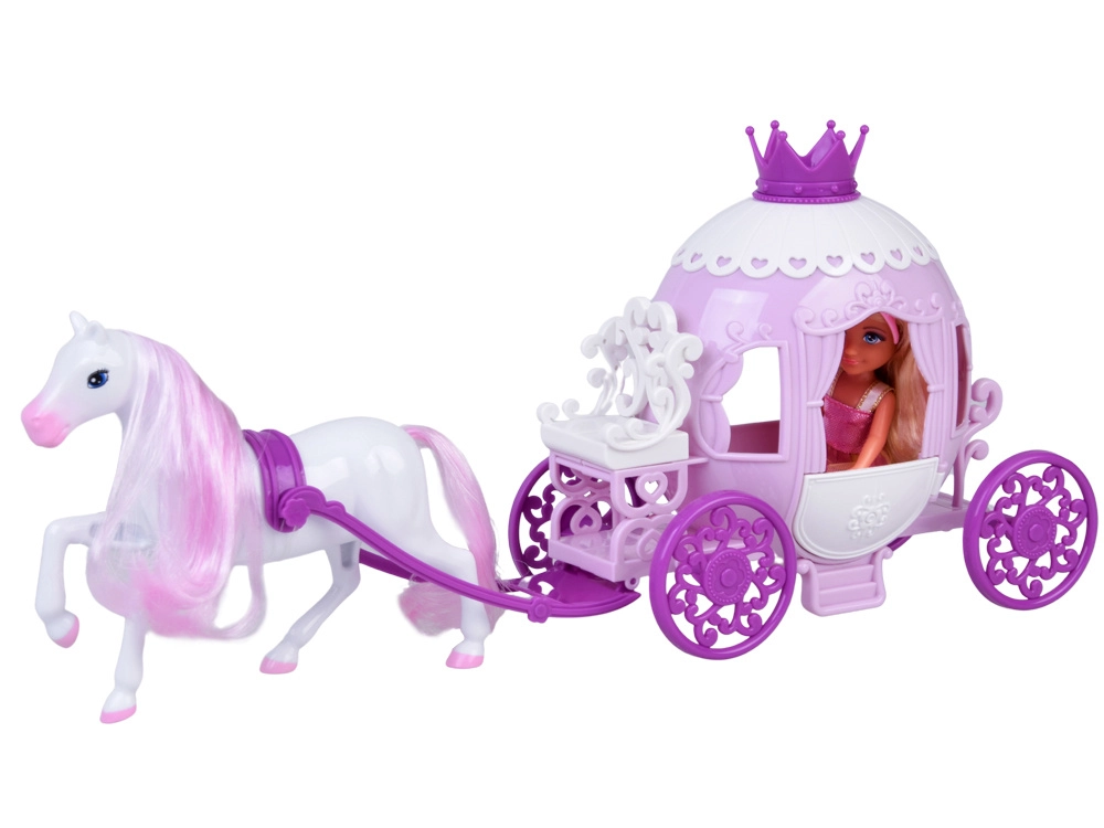 Die rosa-weiße, verzierte Kutsche mit Krone und dekorativen Rädern bringt echte Märchenstimmung ins Spiel. Die Räder drehen sich frei und die Kutsche kann vom Pferd gezogen werden.