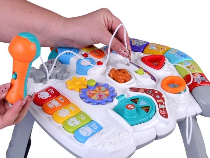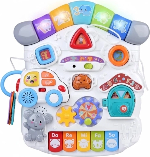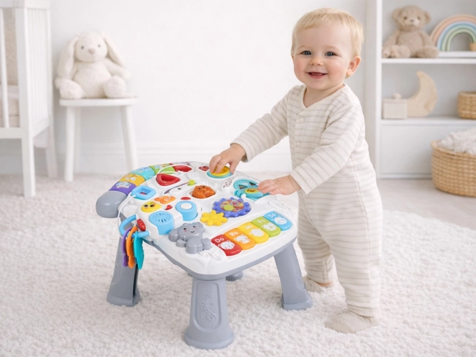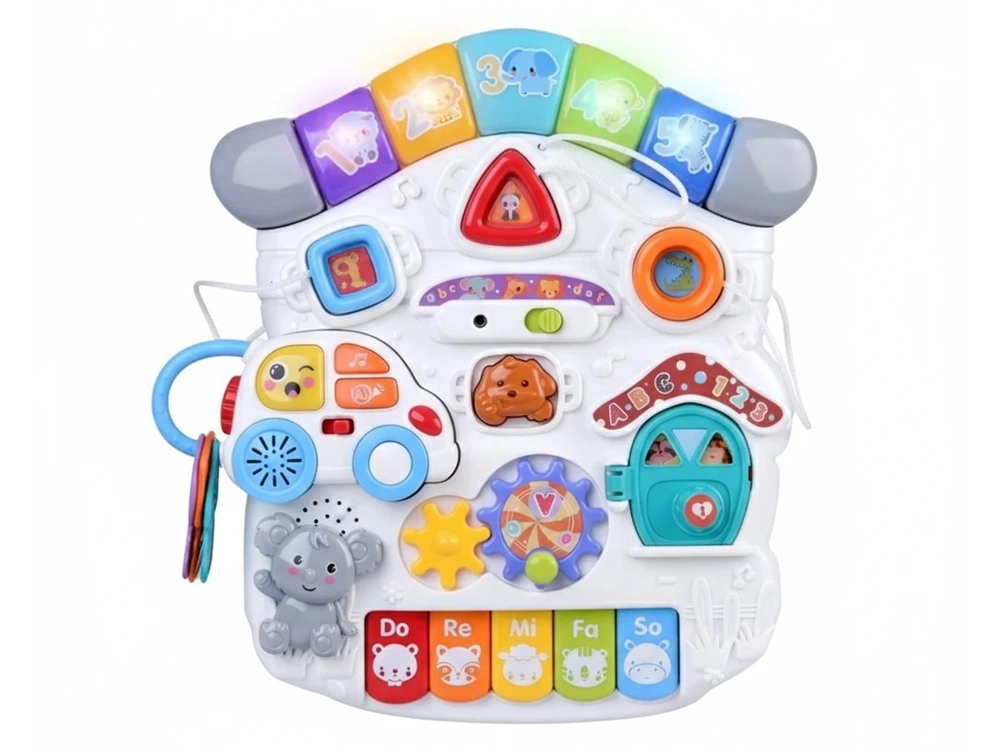 Das Musikpanel mit Do–Re–Mi-Klaviatur, Mikrofon und lustigen Effekten unterstützt die sensorische Entwicklung und den Rhythmus. Das Formenpanel hilft, Farben, Formen und Tiere kennenzulernen, während das abnehmbare Auto mit Schlüsseln auch abseits des Tisches beschäftigt. Dank der vielfältigen Interaktion trainieren Kinder Greifen, Konzentration und logisches Denken.