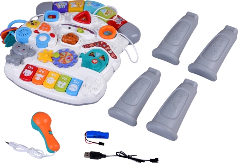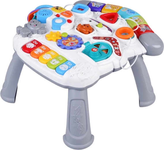 Der interaktive Spieltisch macht jedes Spielen zum Abenteuer. Durch Drücken der Tasten startet das Kind fröhliche Melodien, Lichter und Tiergeräusche, dreht Zahnräder, verschiebt Elemente und entdeckt Überraschungen unter Formen. Stabile Beine und eine robuste Verarbeitung gewährleisten eine sichere Nutzung und lange Haltbarkeit.