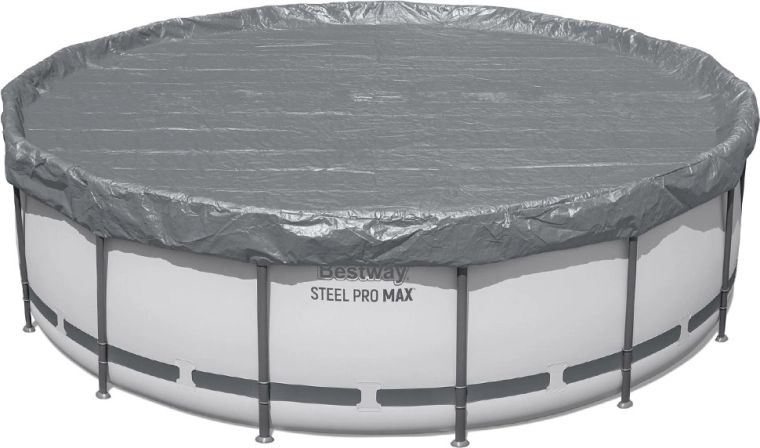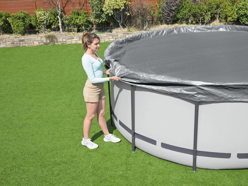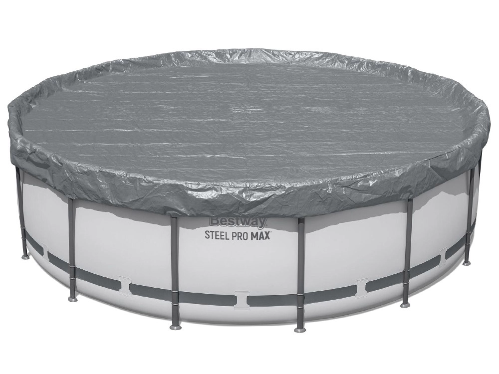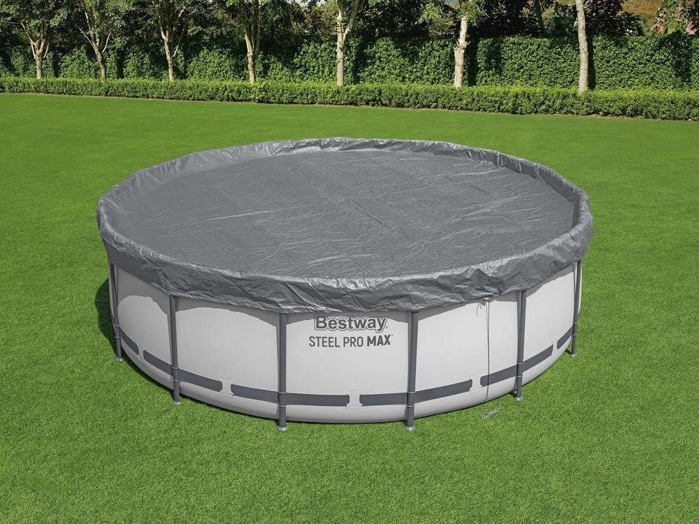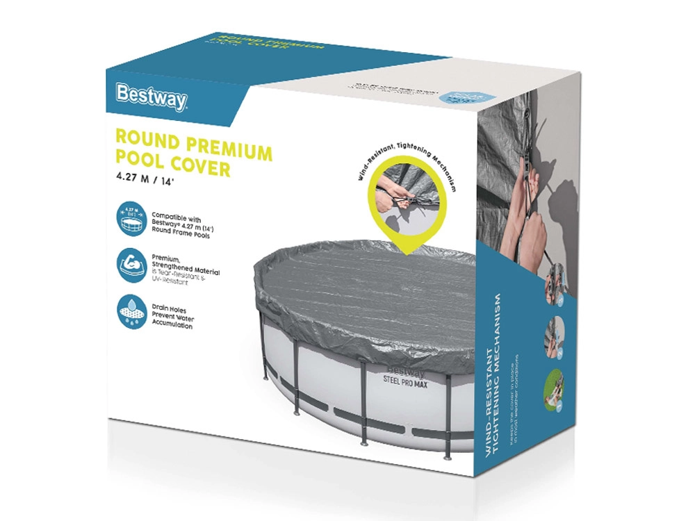 Die runde BESTWAY Premium Abdeckplane ist für Aufstellpools mit einem Durchmesser von 4,27 m konzipiert. Das widerstandsfähige, verstärkte Material mit UV-Schutz verlängert die Lebensdauer und hilft, das Wasser sauberer zu halten – mit weniger Pflegeaufwand. Die Plane lässt sich leicht aufziehen und widersteht dank fester Verspannung üblichen Witterungsbedingungen.
