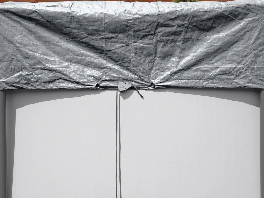 Praktische Drainagelöcher leiten Niederschläge ab, sodass sich keine Pfützen oder übermäßige Last auf der Plane bilden. Die spezielle Oberflächenbehandlung Polar‑Shield behält ihre Eigenschaften auch bei niedrigen Temperaturen bis −25 °C, sodass Sie die Plane langfristig nutzen können.