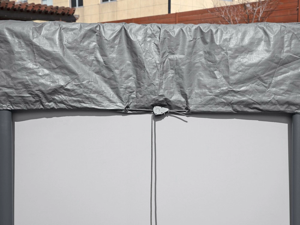 Das windfeste Spannsystem und die Zugmechanismen halten die Plane stabil an Ort und Stelle und verhindern, dass sie vom Wind abgehoben wird.