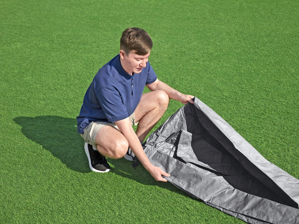 Praktische Drainagelöcher leiten Regenwasser ab, sodass sich keine schweren Pfützen auf der Plane bilden. Das windfeste Spannsystem hält die Plane fest an Ort und Stelle und sorgt für zuverlässiges Anliegen am Poolrand.