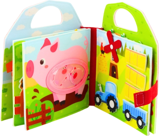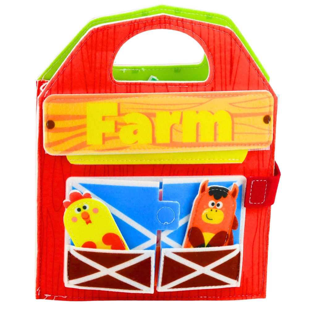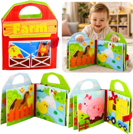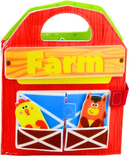 Dieses farbenfrohe sensorische Buch in Bauernhof-Form bietet Kindern viele Aktivitäten: zu öffnende Türen, bewegliche und versetzbare Filzteile sowie haptische Elemente, die zum Entdecken einladen. Spielerisch lernen Kinder Farmtiere (Kuh, Pferd, Ferkel, Ente u. a.), Farben und Formen zu erkennen und entwickeln dabei ihre Sinne.