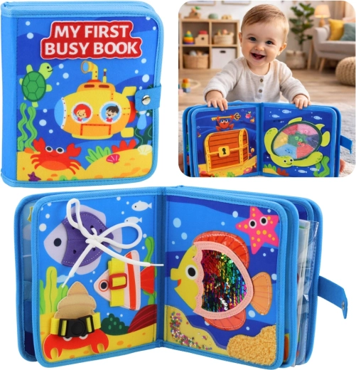 Dieses kreative sensorische Filzbuch mit Meeresmotiv zeigt Fische, eine Schildkröte, eine Krabbe und eine Schatztruhe. Jede Seite bietet andere Aufgaben und Impulse zur Förderung der Auge-Hand-Koordination, der Konzentration sowie des Erkennens von Farben und Formen. Dank der weichen Ausführung ist es ideal für Kleinkinder und Vorschulkinder.
