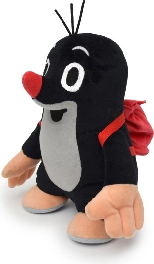 Der Maulwurf ist mit einem roten Rucksack ausgestattet, der die Verspieltheit und Interaktivität des Spielzeugs erhöht.