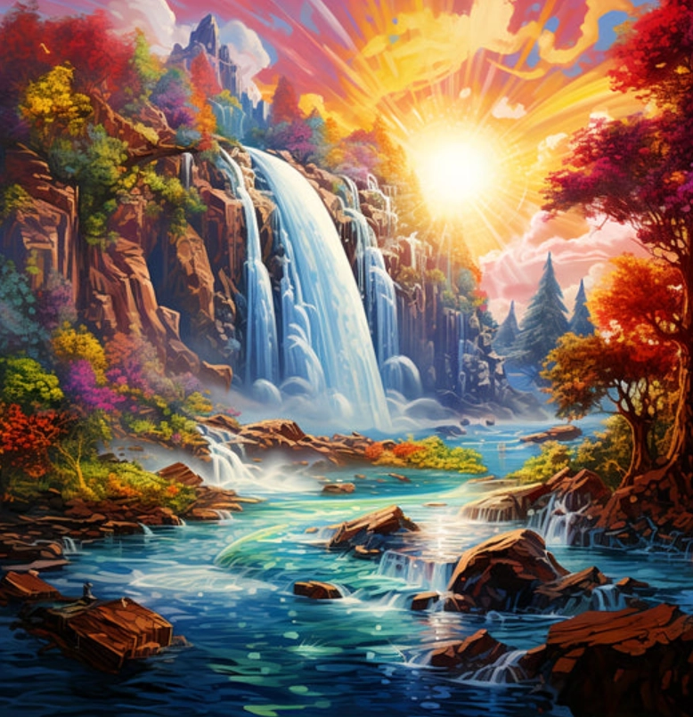 Verwandeln Sie freie Momente in Entspannung mit einem glänzenden Ergebnis. Diamant-Malerei ist einfach: Mit dem Applikationsstift setzen Sie kleine Steinchen auf die markierten Stellen der selbstklebenden Leinwand. Das Ergebnis ist ein strahlendes Mosaikbild mit dem Motiv eines Sonnenuntergangs am Wasserfall, das Sie nach Fertigstellung rahmen und ausstellen können.