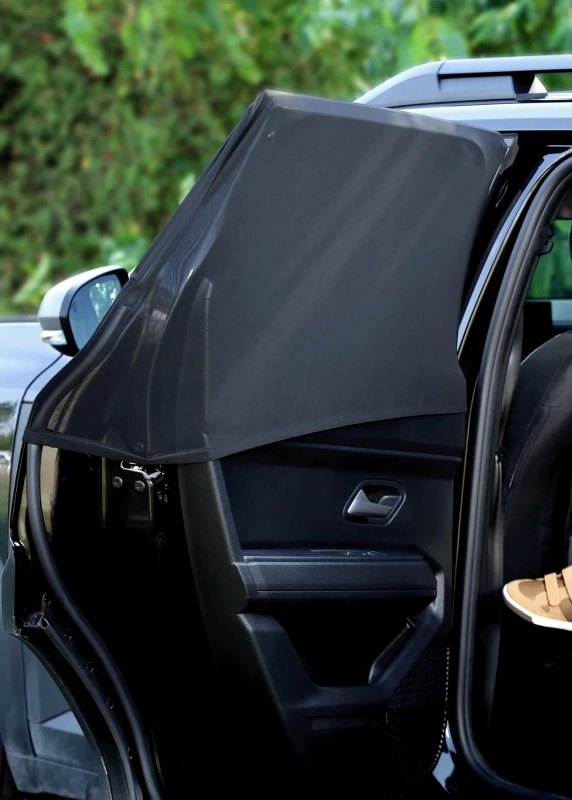 Die Blende dient auch als Moskitonetz – genießen Sie frische Luft bei geöffnetem Fenster ohne Mücken. Nach der Fahrt verstauen Sie sie im mitgelieferten Beutel.