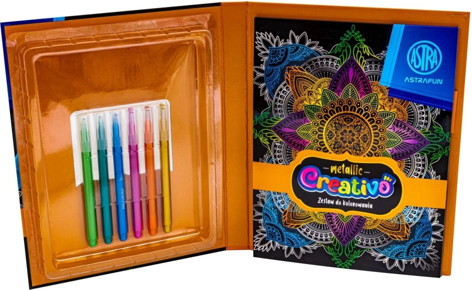 Entdecken Sie die Freude am Ausmalen mit Metallic-Effekt. Das Ausmalset ASTRA CREATIVO kombiniert hochwertige Metallicfarben mit sorgfältig vorbereiteten Motiven, wodurch das Gestalten leicht und sehr befriedigend ist. Glänzende Farbtöne verleihen jedem Bild ein einzigartiges Aussehen und Ausdrucksstärke.