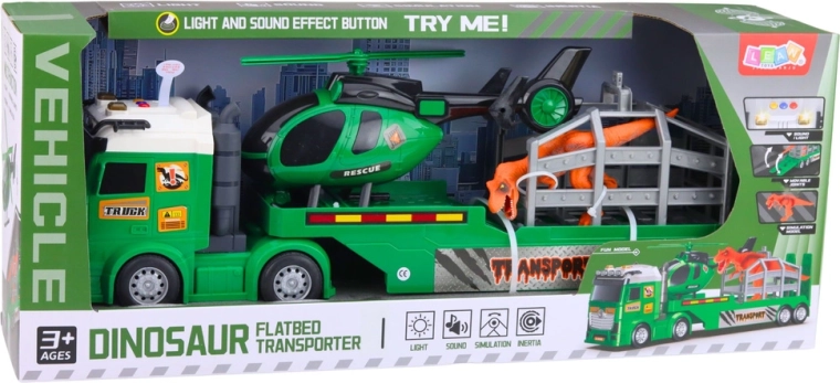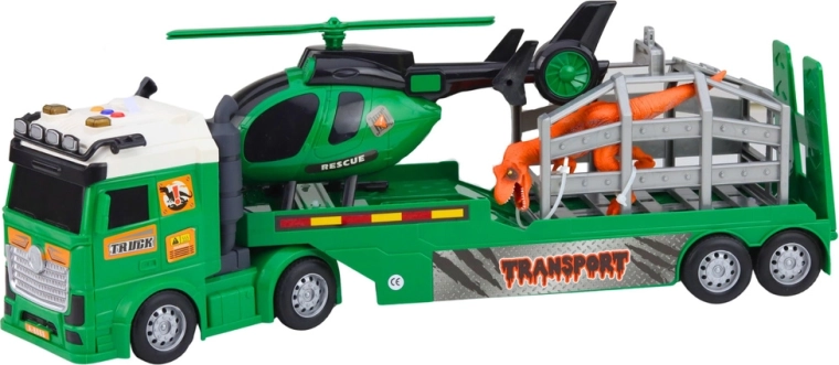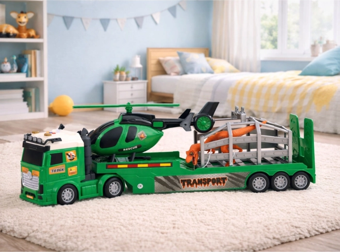 Dieses durchdachte Transportset in Grün mit den Aufdrucken TRANSPORT und RESCUE ist ideal für kleine Fans prähistorischer Wesen und Rettungsmissionen. Der große Sattelzug mit Auflieger transportiert sowohl den Käfig mit Dinosaurier als auch den Rettungshubschrauber, sodass Kinder Rettungseinsätze, Fänge und Spezialtransporte planen können.